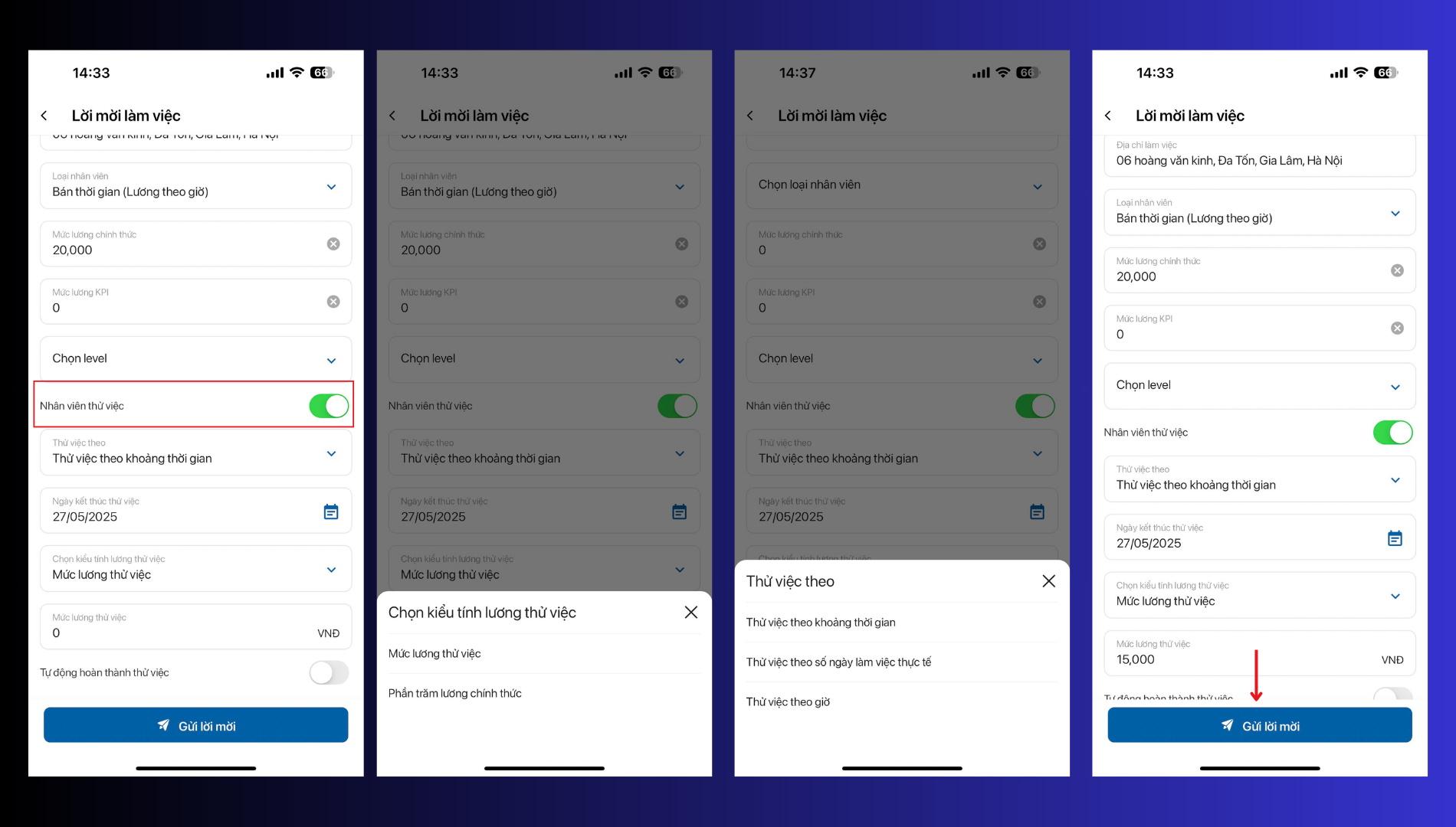 Bước 1: Trên thanh tác vụ chọn Lời mời làm việc, ở giao diện điền thông tin lời mời bật tính năng nhân viên thử việc lên và điền các thông tin: kiểu tính lương thử việc, Kiểu thử việc, mức lương thử việc, ngày kết thúc thử việc