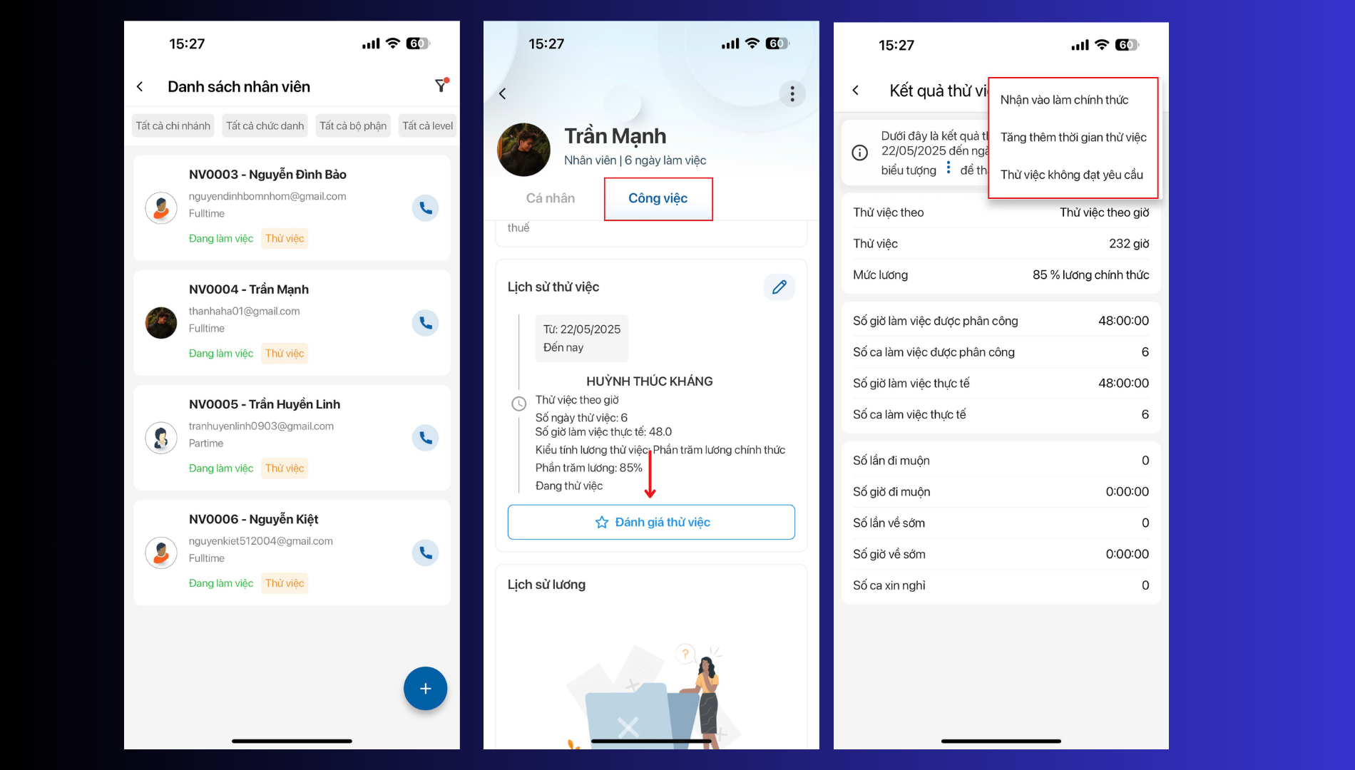 Chọn đánh giá để xem kết quả quá trình thử việc bằng cách chọn vào dấu ba chấm góc màn hình