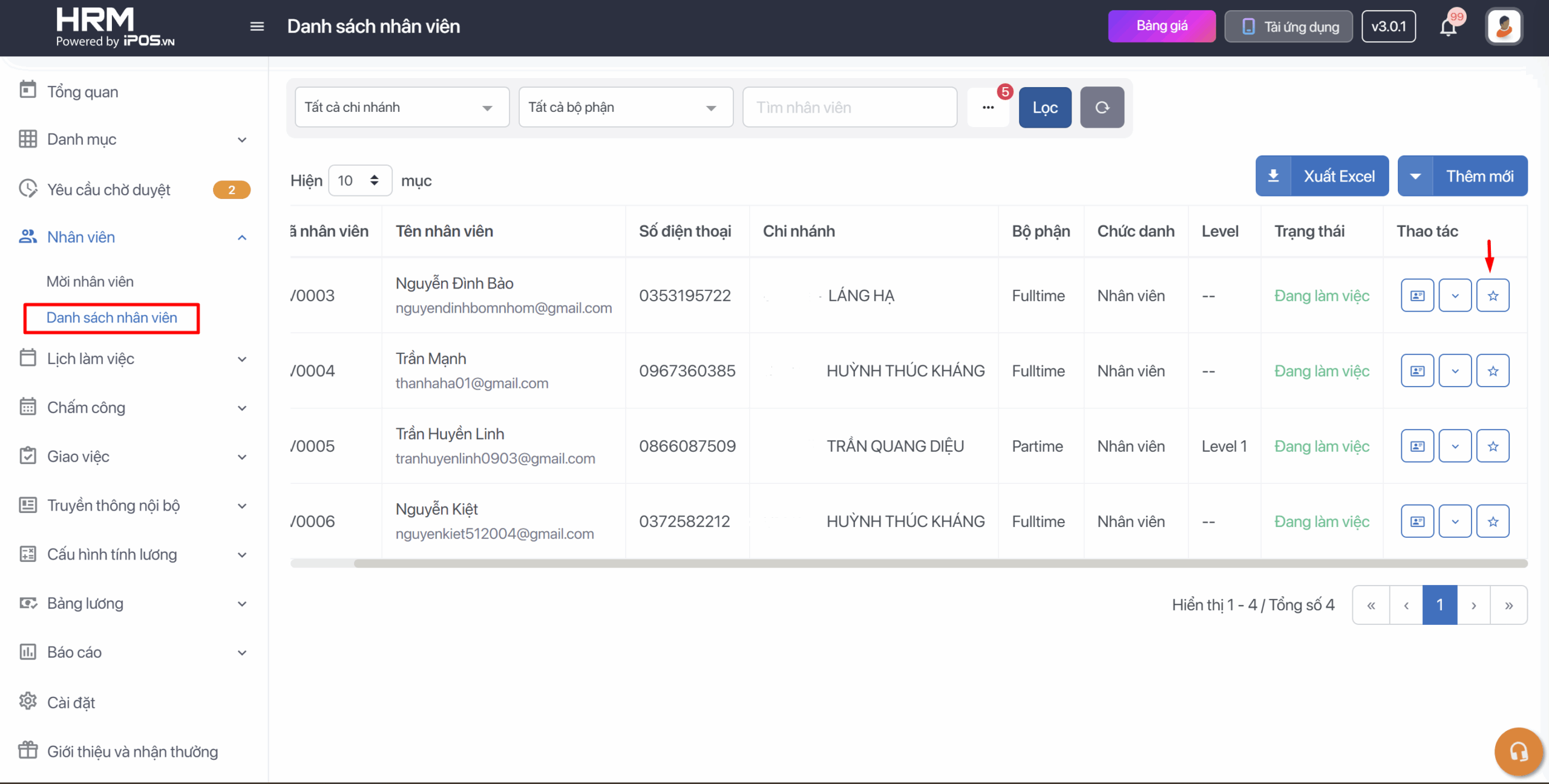 Bước 1: Trên thanh tác vụ chọn Danh sách nhân viên  Chọn trang thông tin chi tiết của nhân viên bạn muốn chỉnh sửa
