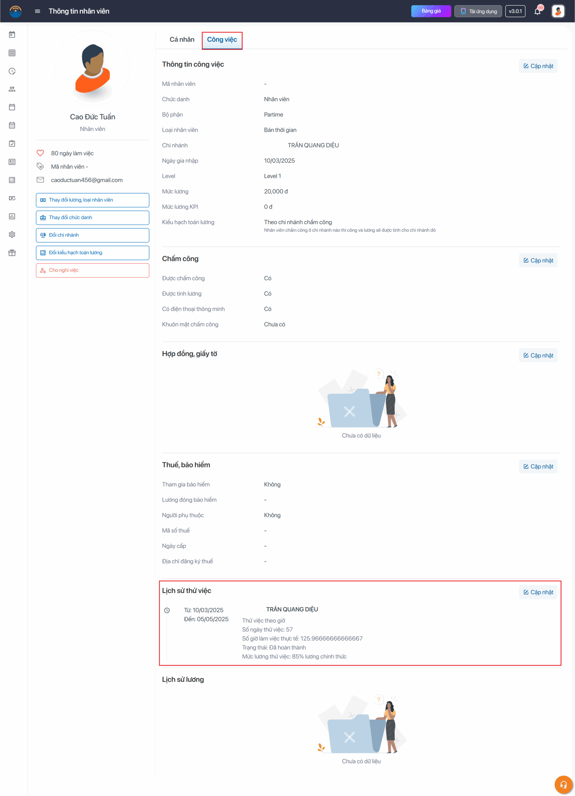 Bước 2: Chọn Công việc →  Kéo xuống chọn vào Lịch sử thử việc Chọn Cập nhật để chỉnh sửa lịch sử thử việc
