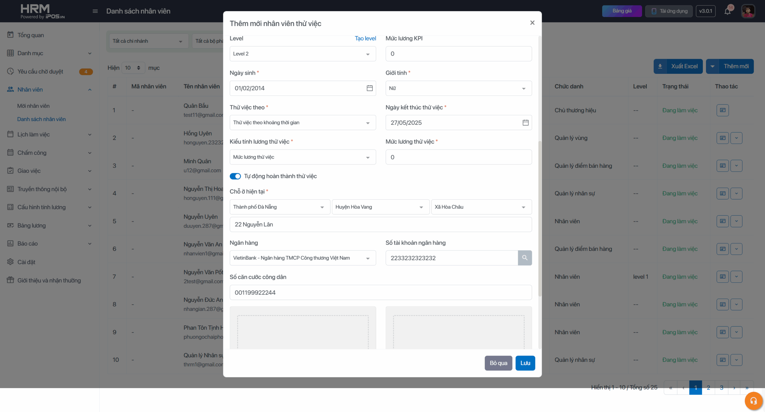 Bước 1: Chọn mục Danh sách nhân viên → Chọn thêm mới → Nhân viên thử việc . Sau đó điền thông tin nhân viên thử việc nhấn lưu lại