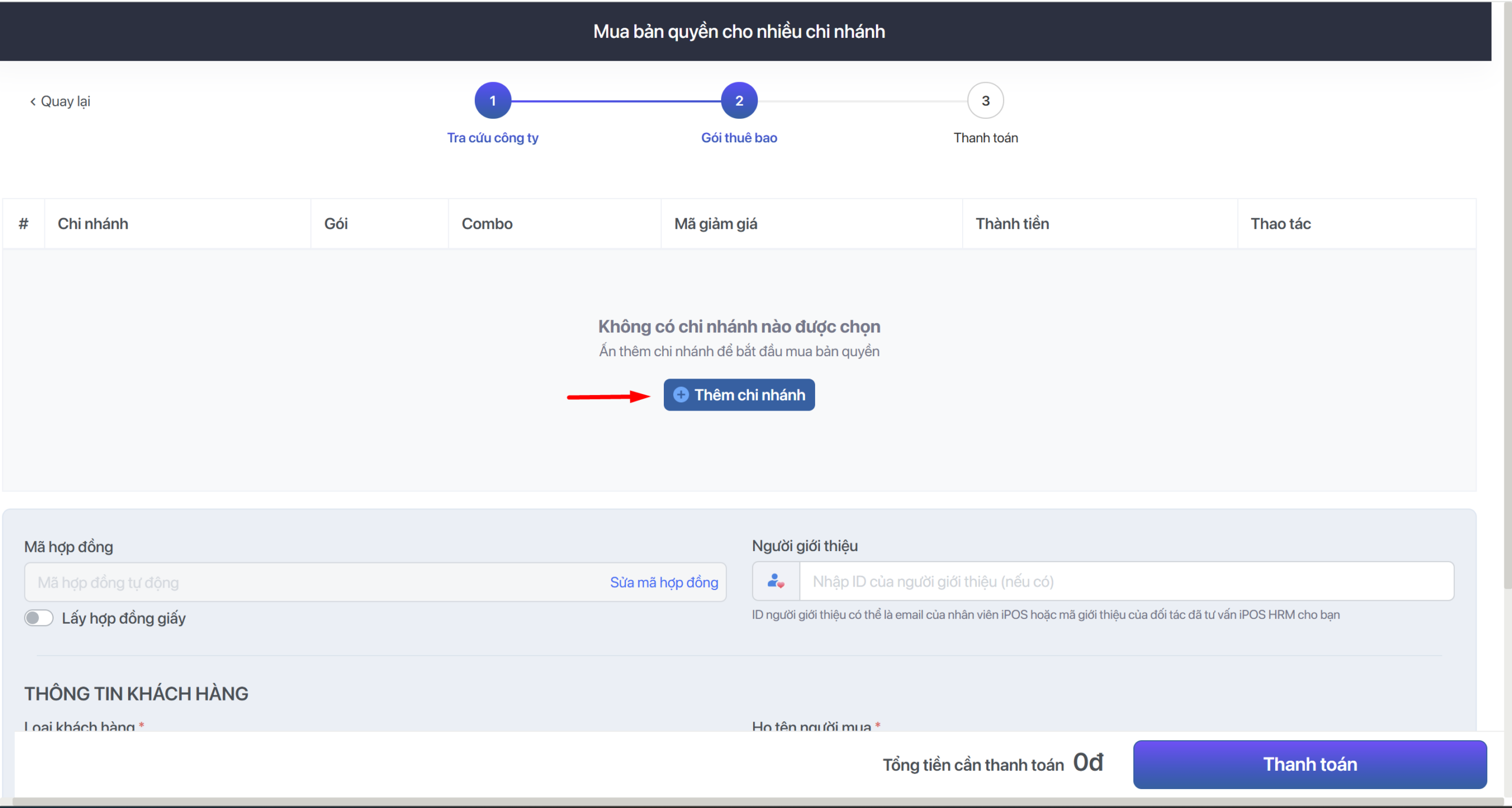 Chọn gói thuê bao phù hợp với chi nhánh, hệ thống sẽ tự detect và chỉ hiển thị các gói phù hợp ( bằng/ lớn hơn số lượng nhân viên thực tế) hoặc các gói gia hạn theo rule gia hạn của công ty.