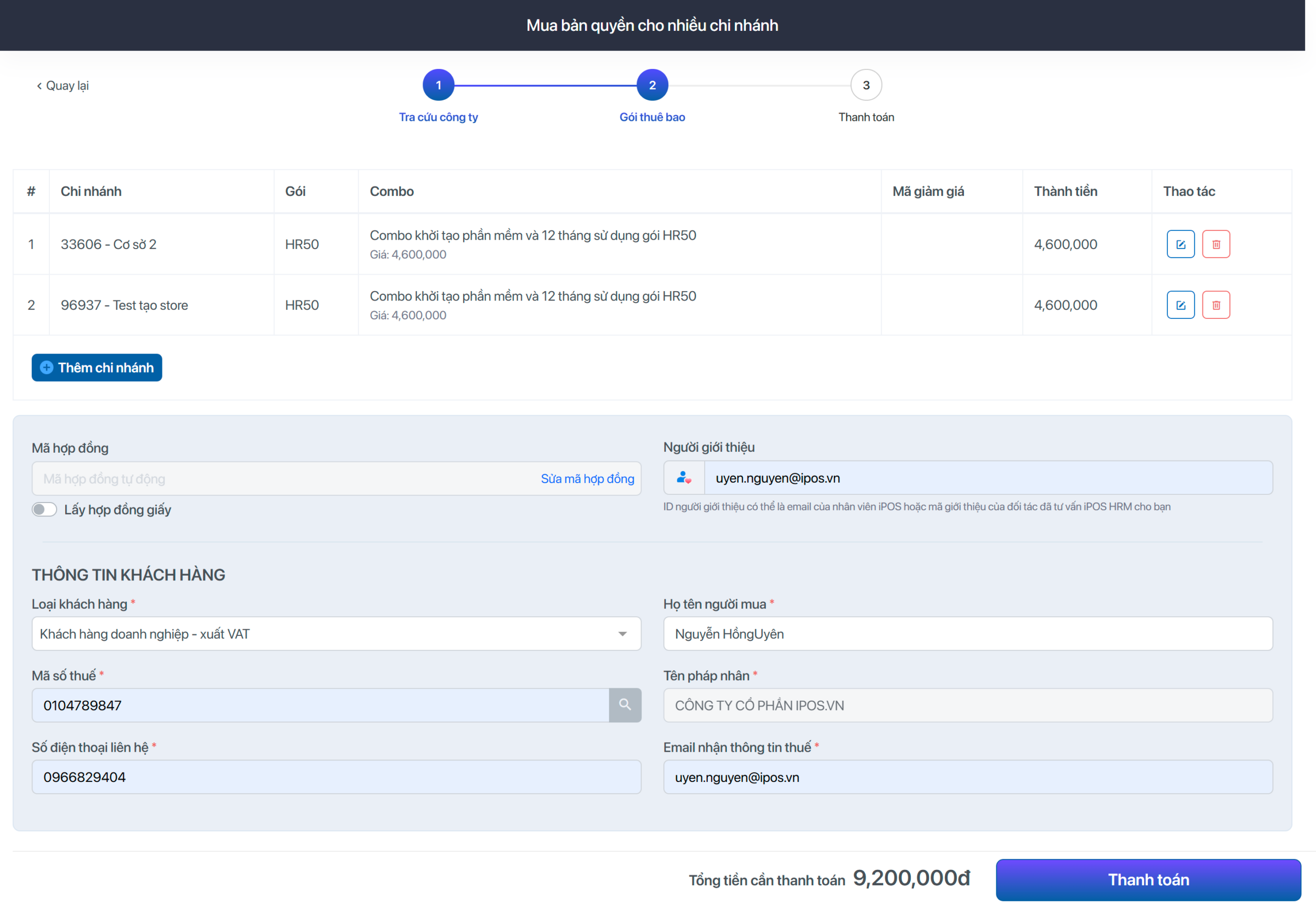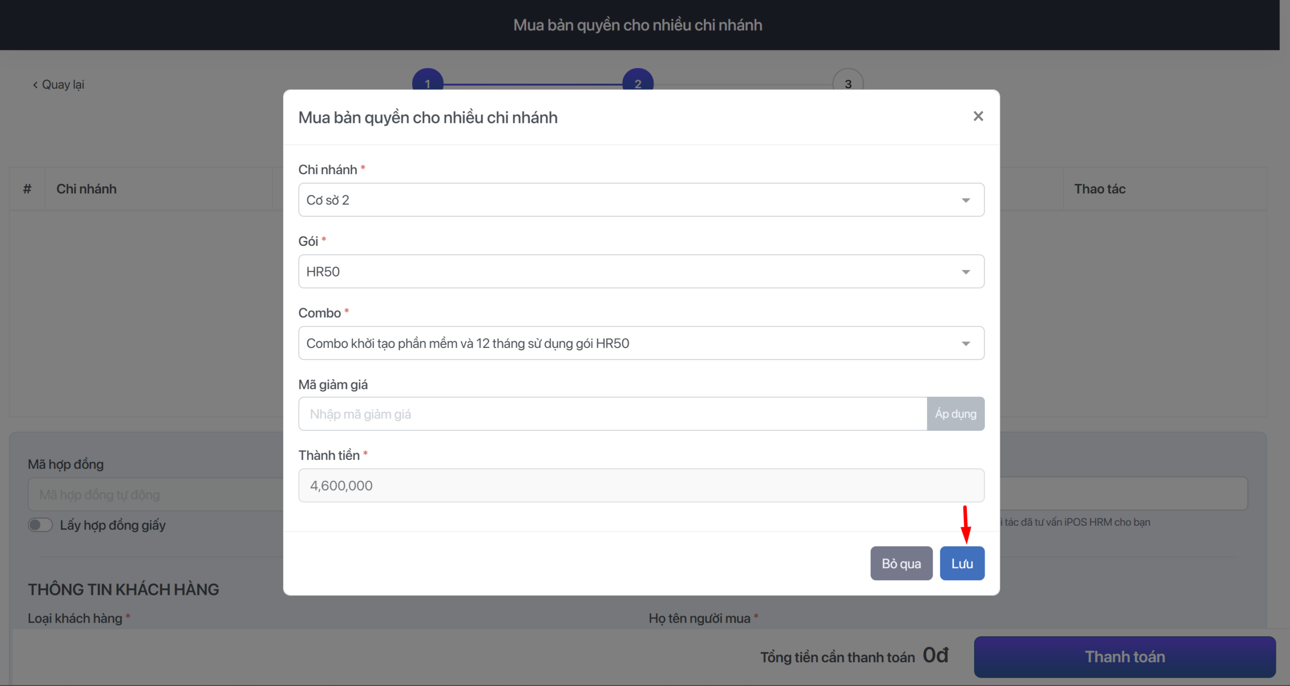 Bước 2: Chọn chi nhánh bạn muốn active bản quyền cho khách, có thể chọn 1 hoặc nhiều chi nhánh để thanh toán.