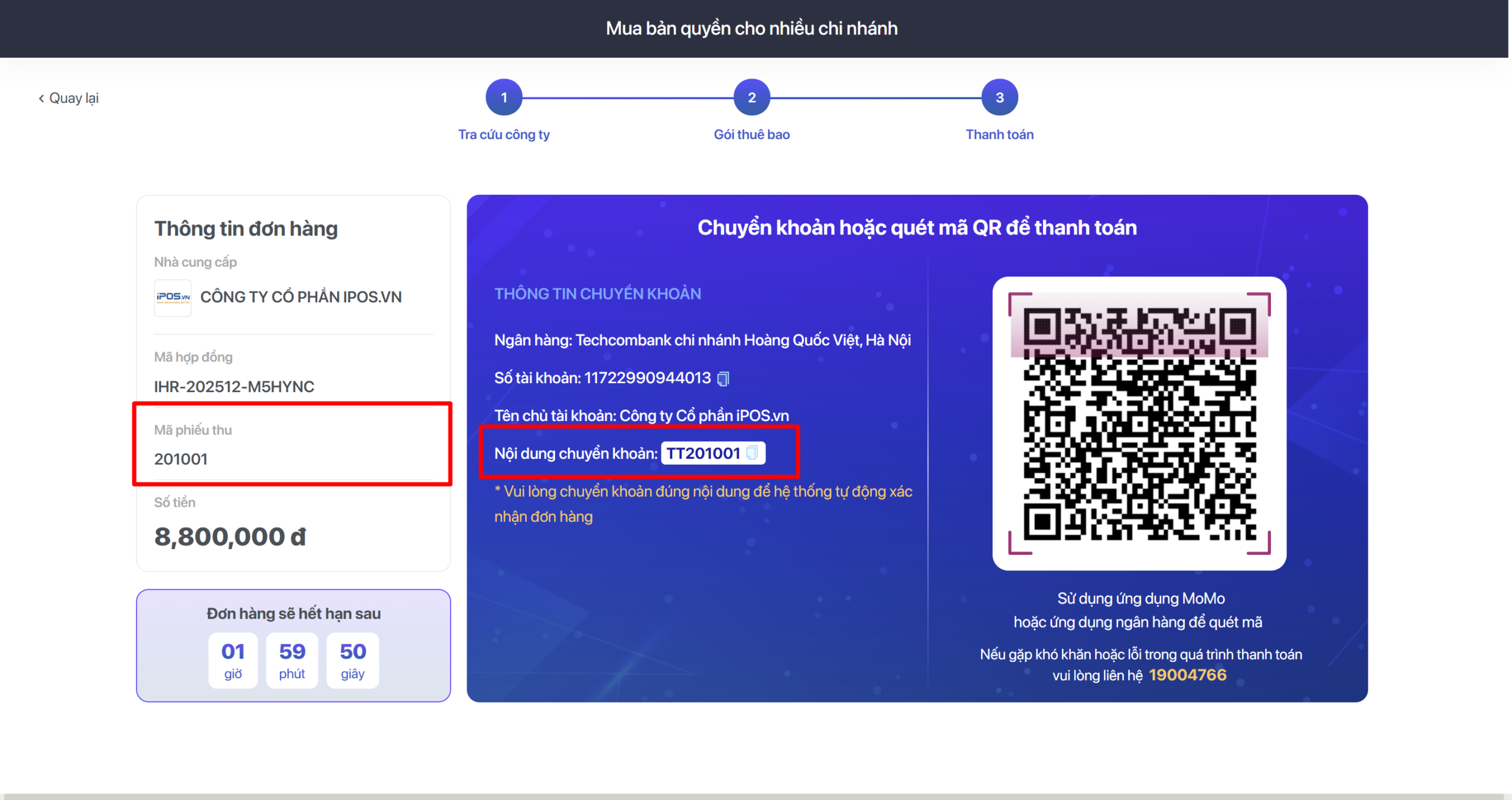 – Mã QR chỉ có hiệu lực trong vòng 2 tiếng. Trong trường hợp mã hết hạn, hãy thao tác mua bản quyền 1 lần nữa để hệ thống sinh ra mã QR mới.