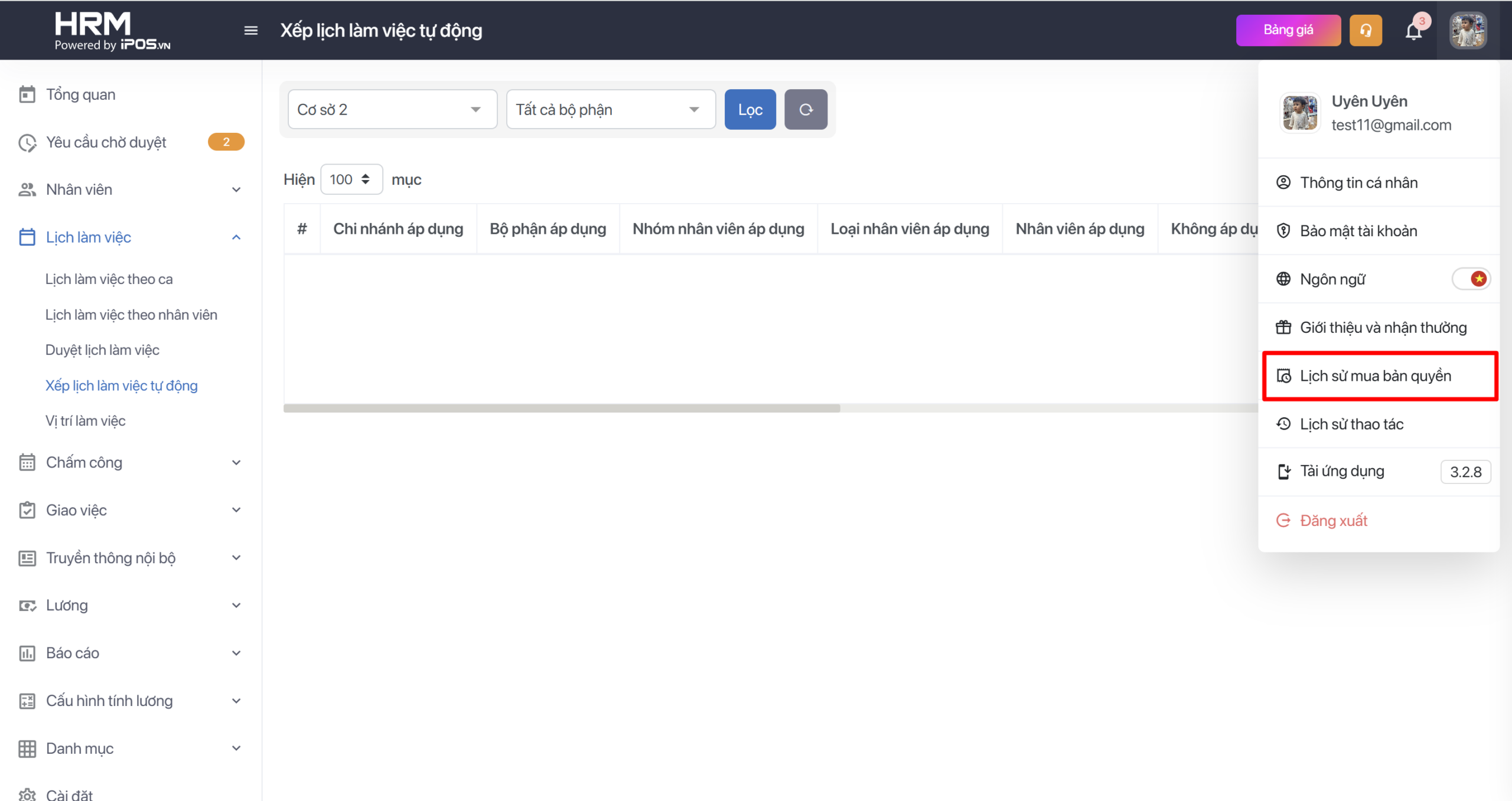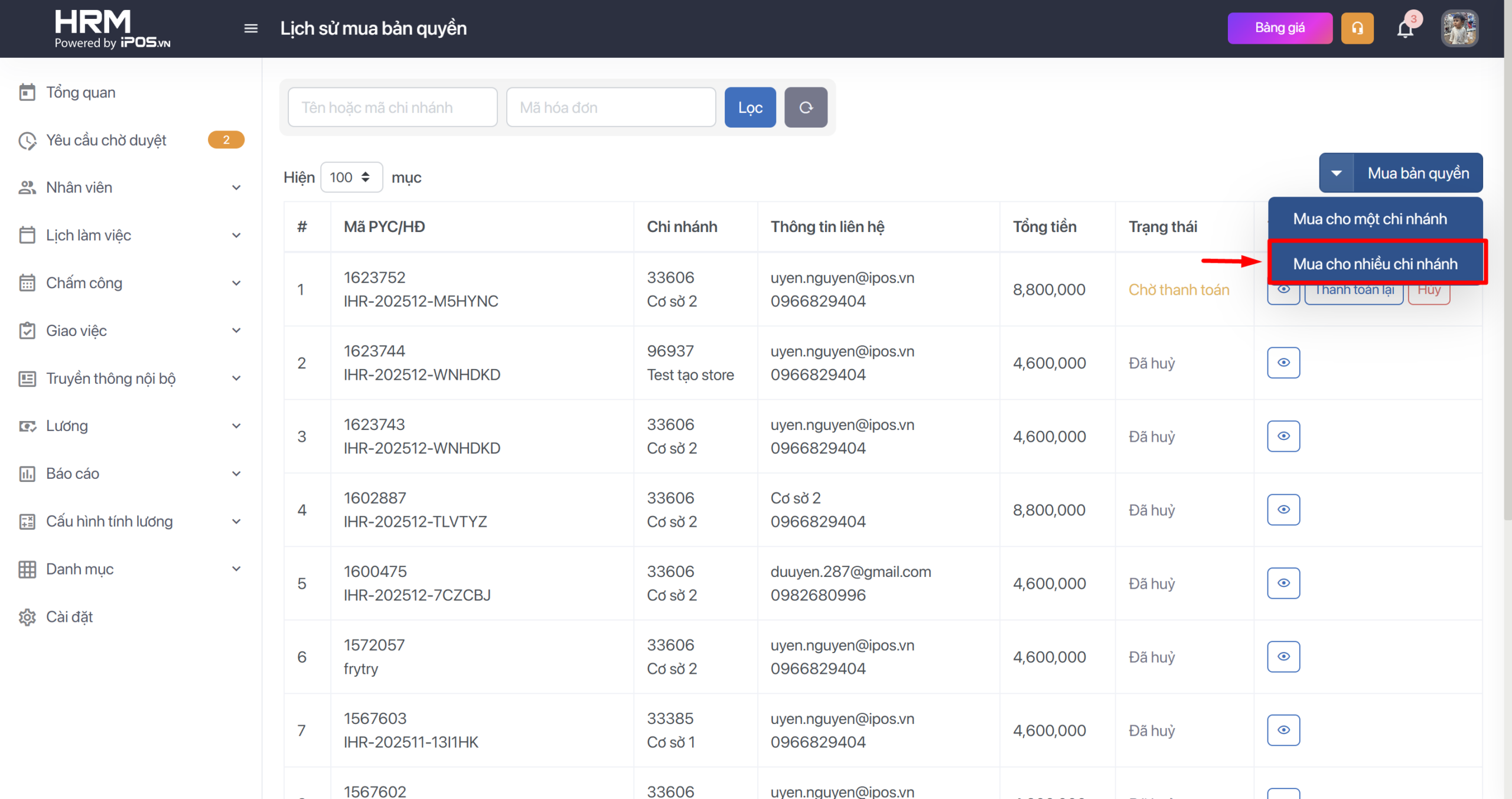 Bước 1: Trang chủ chọn Lịch sử bản quyền → Chọn Mua bản quyền → Mua cho nhiều chi nhánh