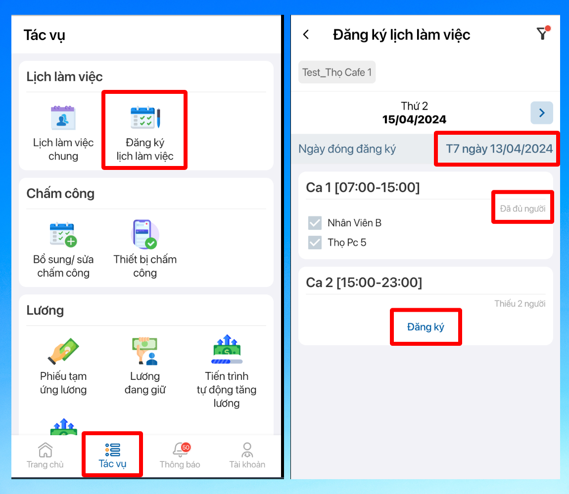 Bước 1: Ở màn hình Tác vụ, bạn chon vào mục Đăng ký lịch làm việc.