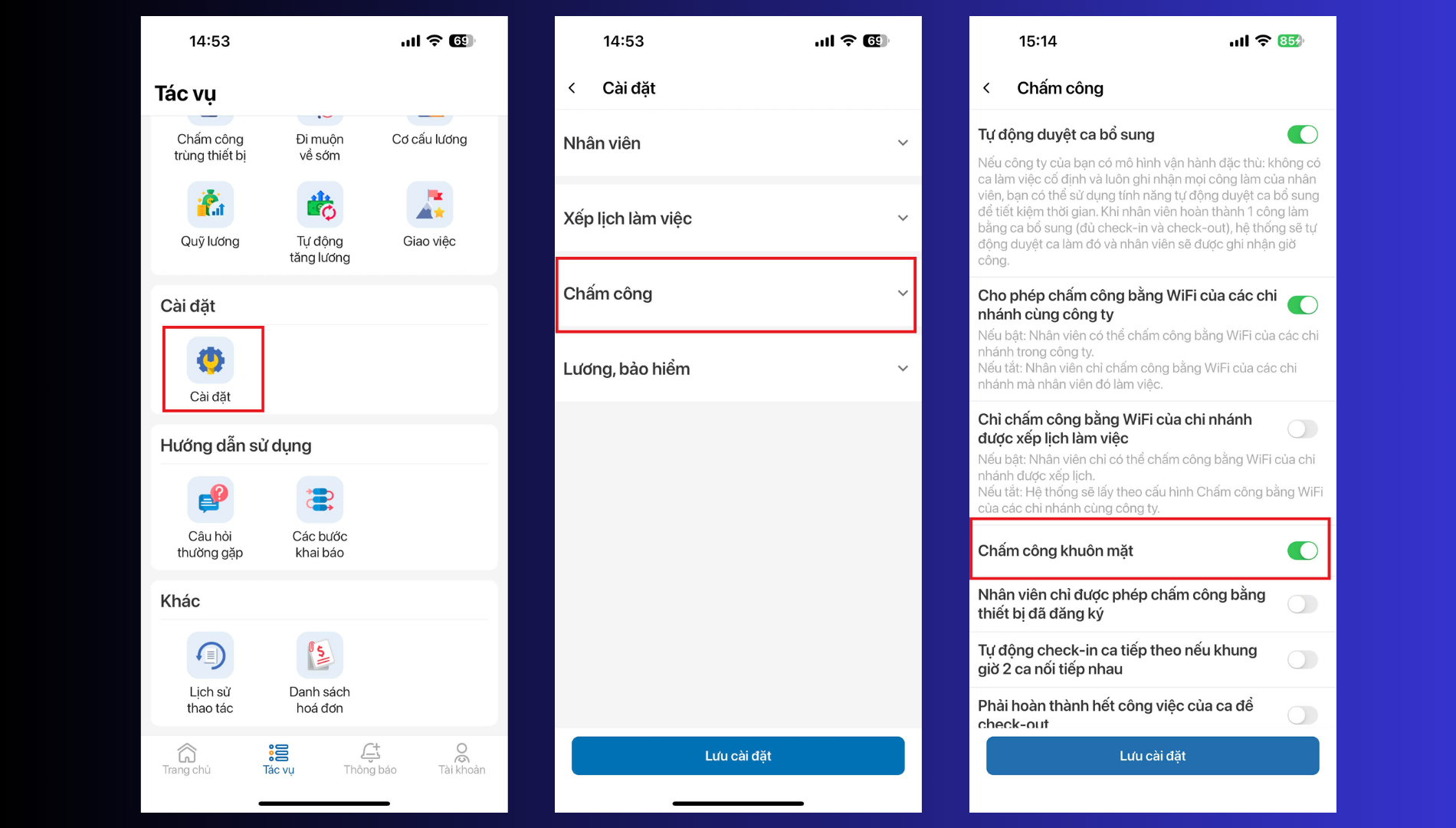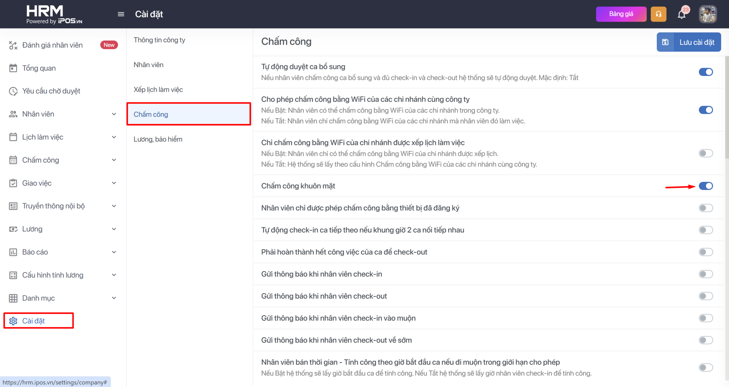 Bước 3: Bật cấu hình cho phép chấm công bằng khuôn măt trong mục Cài đặt  -> Bấm lưu để hoàn thành công việc.