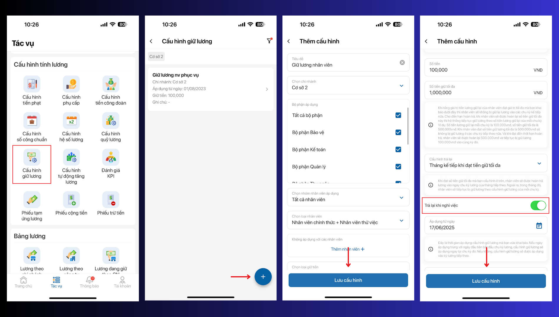 Trường hợp giữ lương đối với nhân viên nghỉ việc: bật tính năng hoàn tiền giữ khi nhân viên nghỉ việc, tiền giữ lương sẽ được hoàn vào kỳ lương của tháng đó.