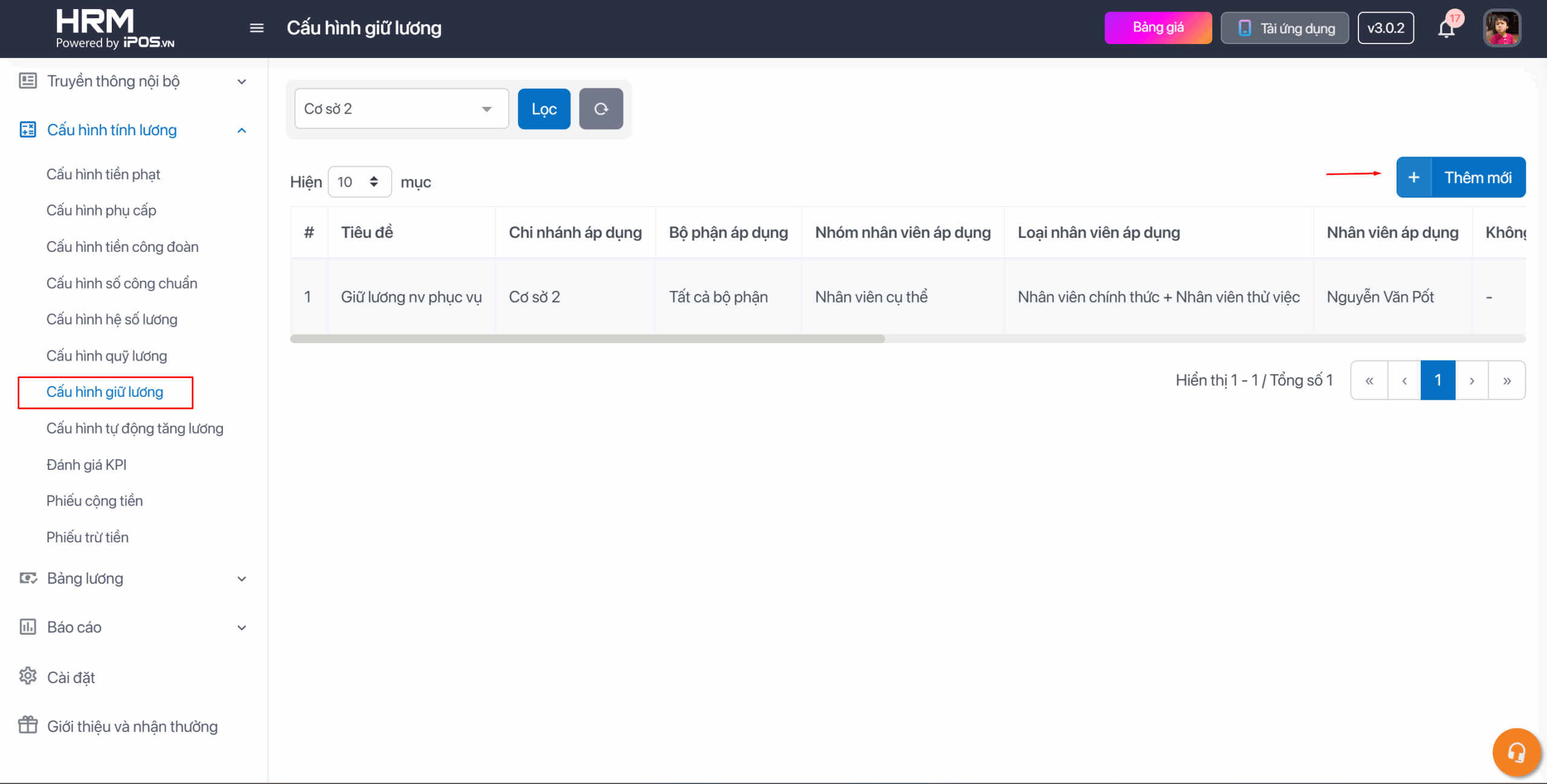 Bước 1: Trên trang chủ chọn vào mục Cấu hình tính lương ->  Cấu hình giữ lương ->  Thêm mới