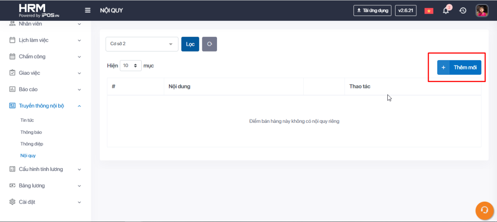 Bước 1: Trên thanh tác vụ chọn Truyền thông nội bộ -> Chọn Nội quy.