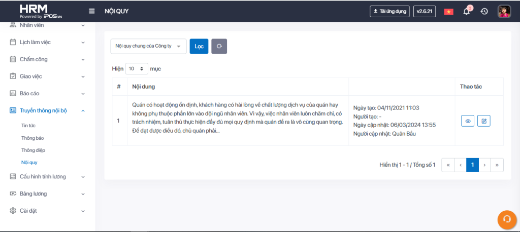 Bạn có thể cấu hình nội quy chung cho toàn công ty hoặc nội quy riêng của từng điểm bán hàng. Trong trường hợp, các điểm bán hàng không có nội quy riêng, hệ thống sẽ sử dụng nội quy chung của công ty để hiển thị. Nội quy sẽ hiển thị tại màn chào mừng nhân viên khi gia nhập hệ thống và hiển thị trong mục Truyền thông nội bộ -> Nội quy trên thanh tác vụ ở App HRM Nhân Viên.