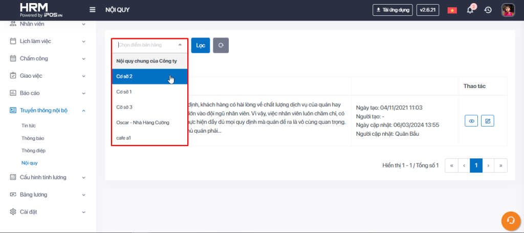 a. Chọn vào điểm bán hàng bạn muốn khai báo nội quy -> bấm vào nút Lọc.