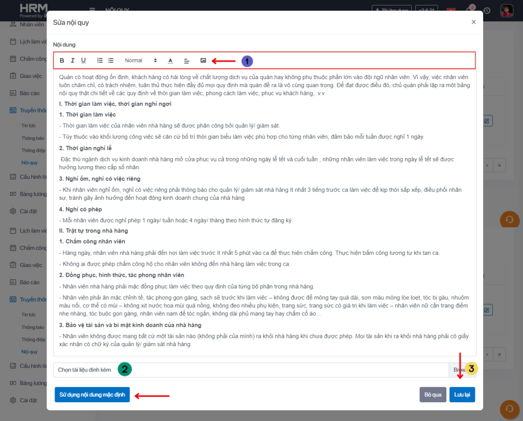 c. Điền nội dung nội quy và bấm Lưu lại để hoàn thành công việc.