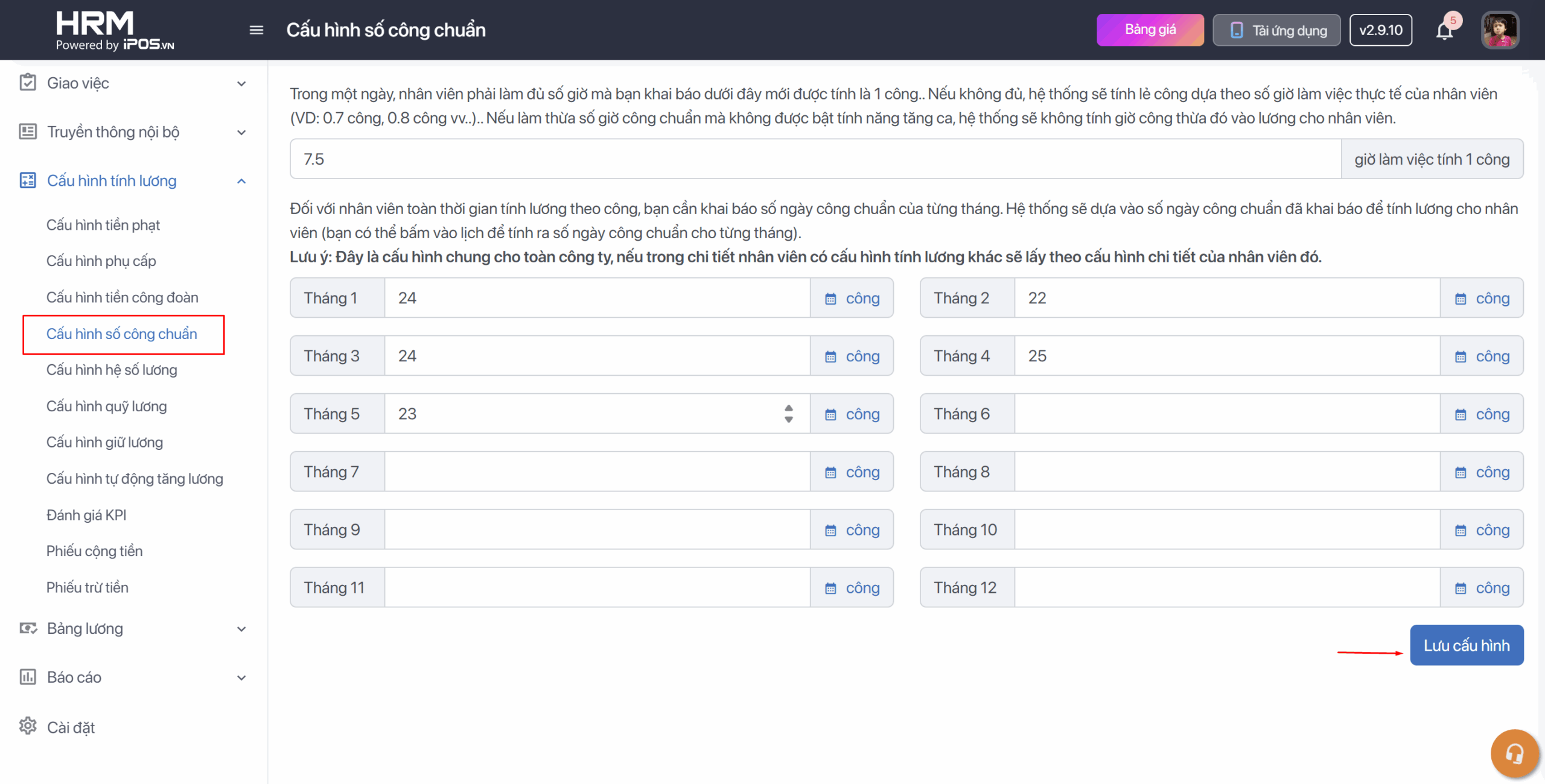 - Nhập số vào các Số ngày công chuẩn của Tháng để phần mềm chia lương của từng công cho nhân viên theo tháng cho chính xác.