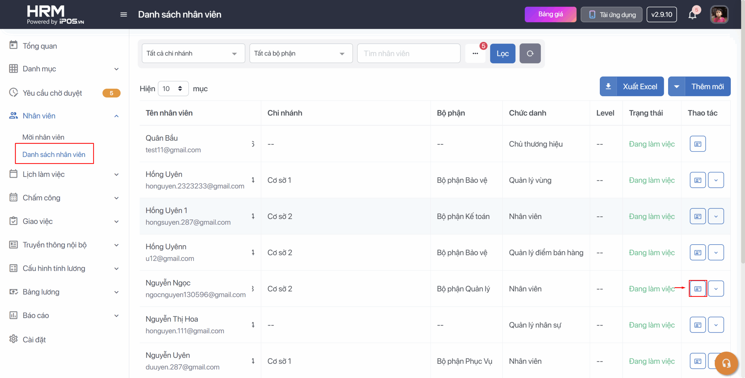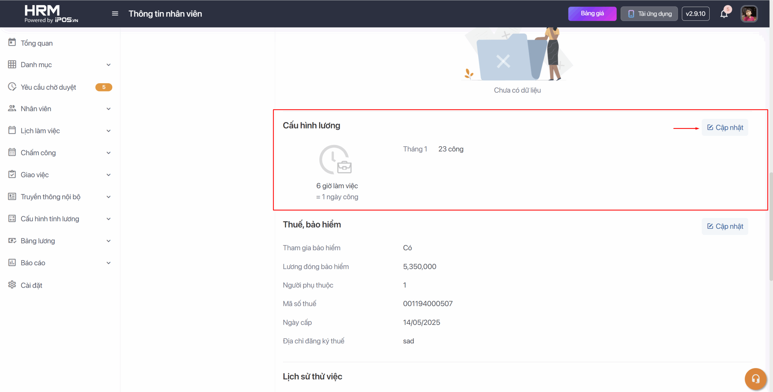 Bước 2: Chọn vào Tên nhân viên → chọn vào mục Công việc → Cấu hình lương → chọn vào nút Thao tác nhập đầy đủ thông tin → chọn vào nút Lưu lại để hoàn thành công việc.