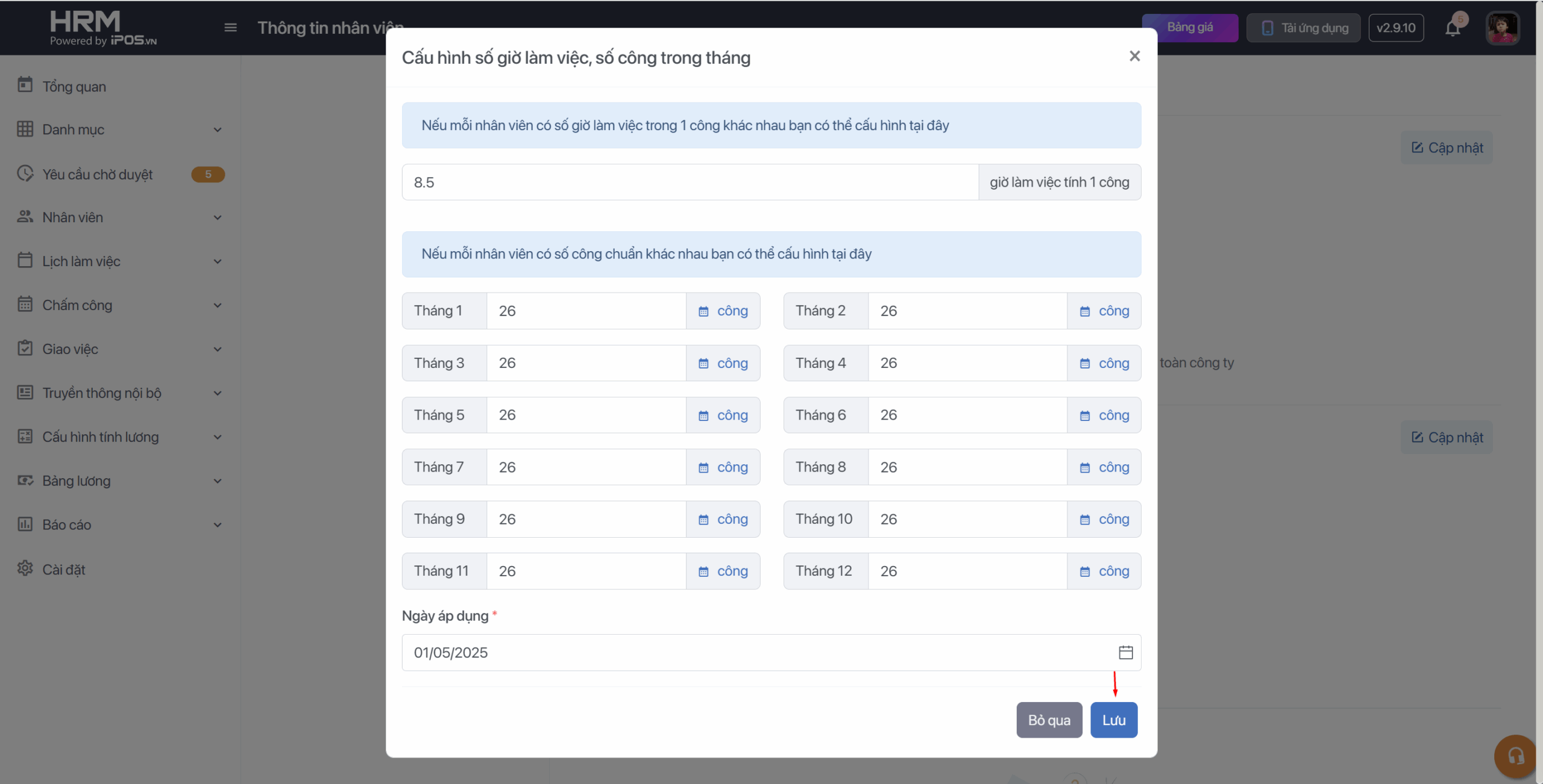 Lưu ý : Trong trường hợp bạn chỉnh sửa số ngày công chuẩn/ giờ công chuẩn cho riêng từng nhân viên cần lưu ý chọn ngày áp dụng trước khi lưu lại cấu hình.