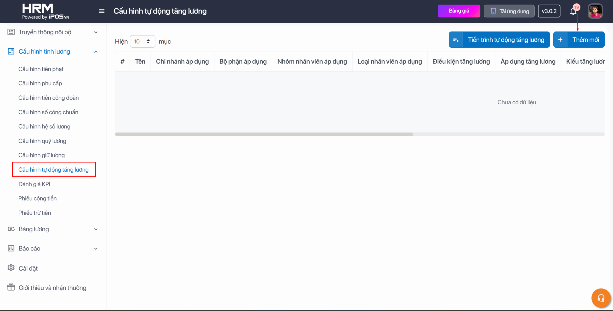 Bước 1: Trên thanh tác vụ chọn Cấu hình tính lương → Cấu hình tự động tăng lương → Chọn vào dấu cộng để thêm mới