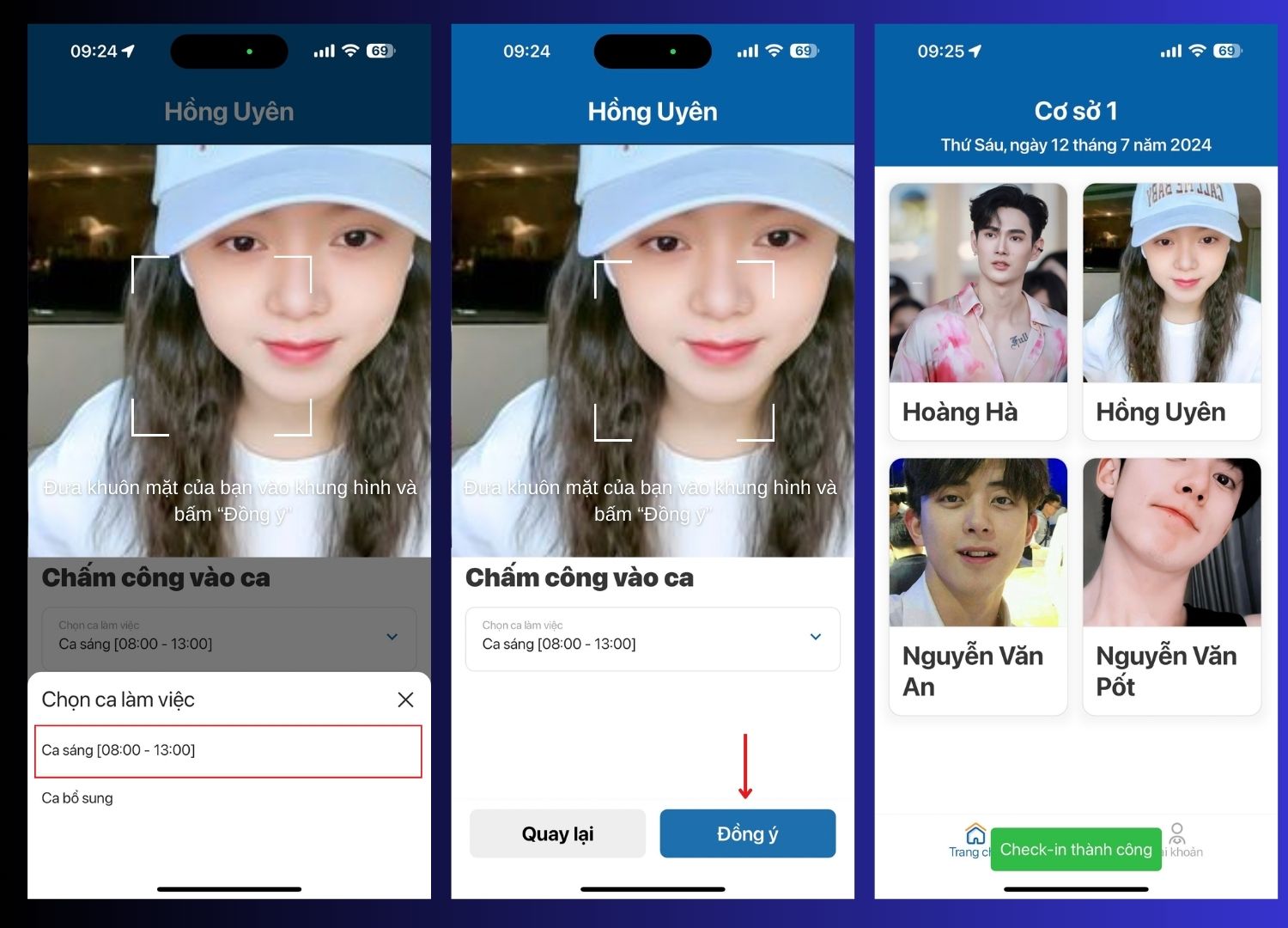Bước 3: Khi nhân viên đến điểm bán, chọn vào tài khoản của mình → Chọn ca làm việc muốn chấm công → Đưa gương mặt vào khung chấm công theo hướng dẫn và bấm đồng ý để check-in.