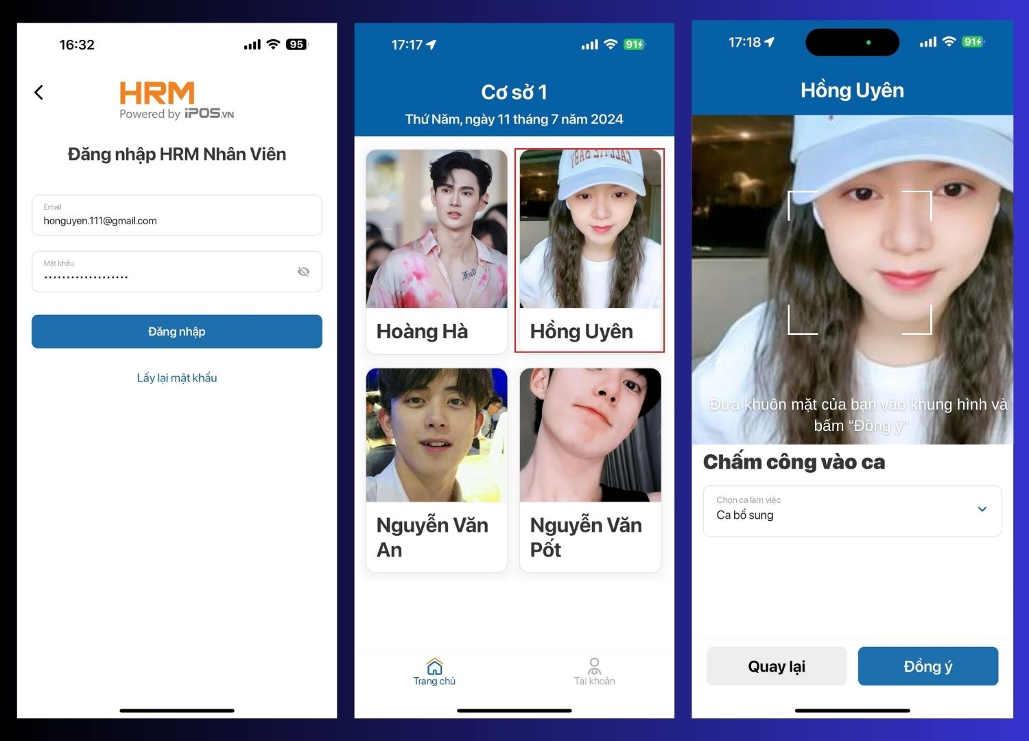 - Xếp lịch làm việc như bình thường, nhân viên đến điểm bán chọn vào tài khoản có gương mặt đại diện của mình trên thiết bị để thực hiện chấm công.