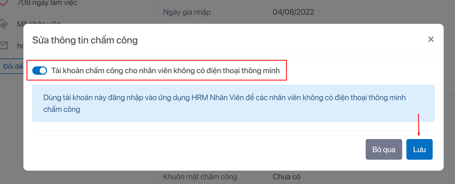 Bước 3: Chọn cấu hình Tài khoản chấm công cho nhân viên không có điện thoại thông minh → Lưu để hoàn thành công việc