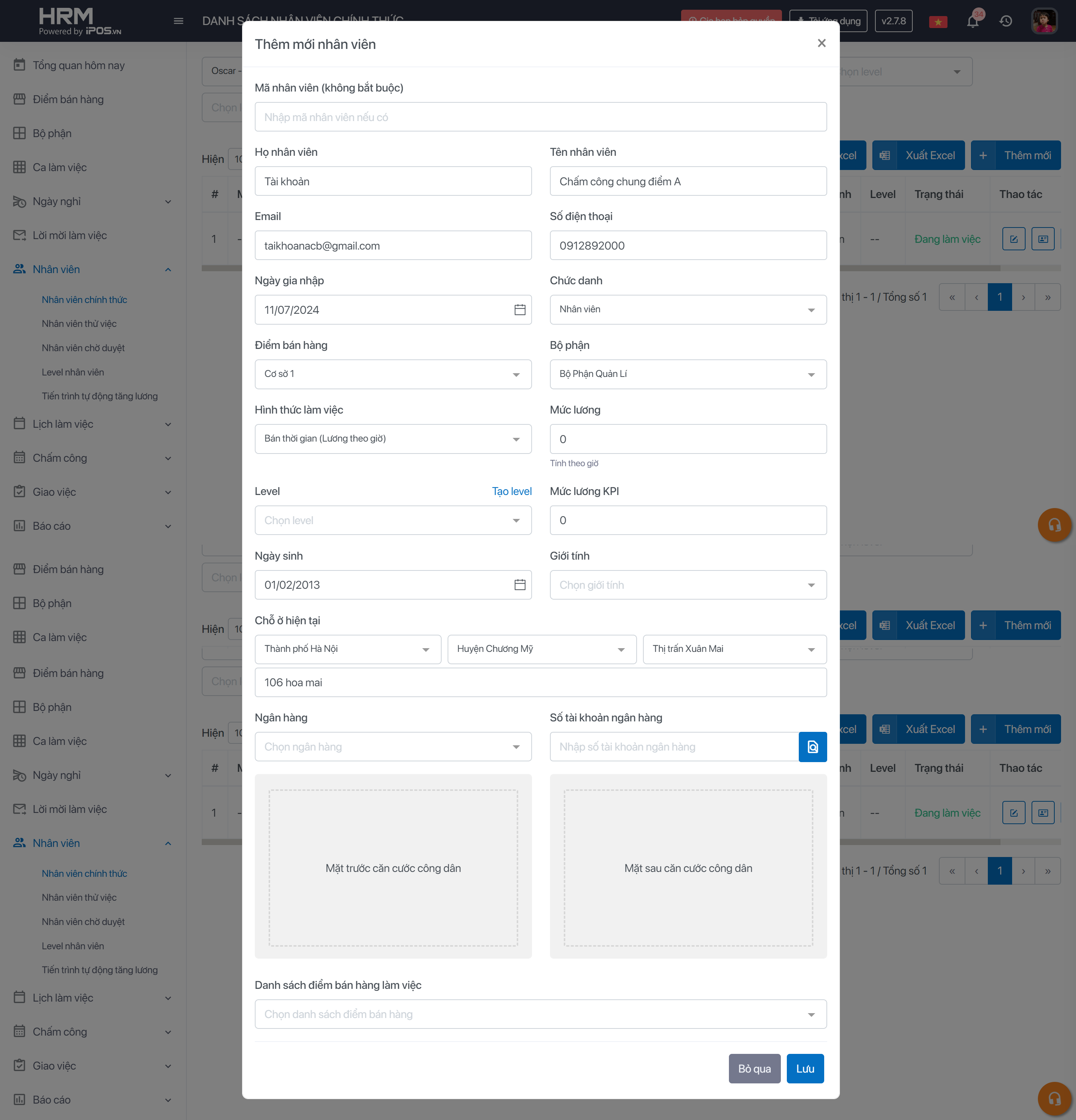 - Điền đầy đủ thông tin, chọn chức danh = nhân viên (có thể điền chính xác hoặc để tên là tài khoản quản lý chấm công chung, mức lương để = 0vnđ)