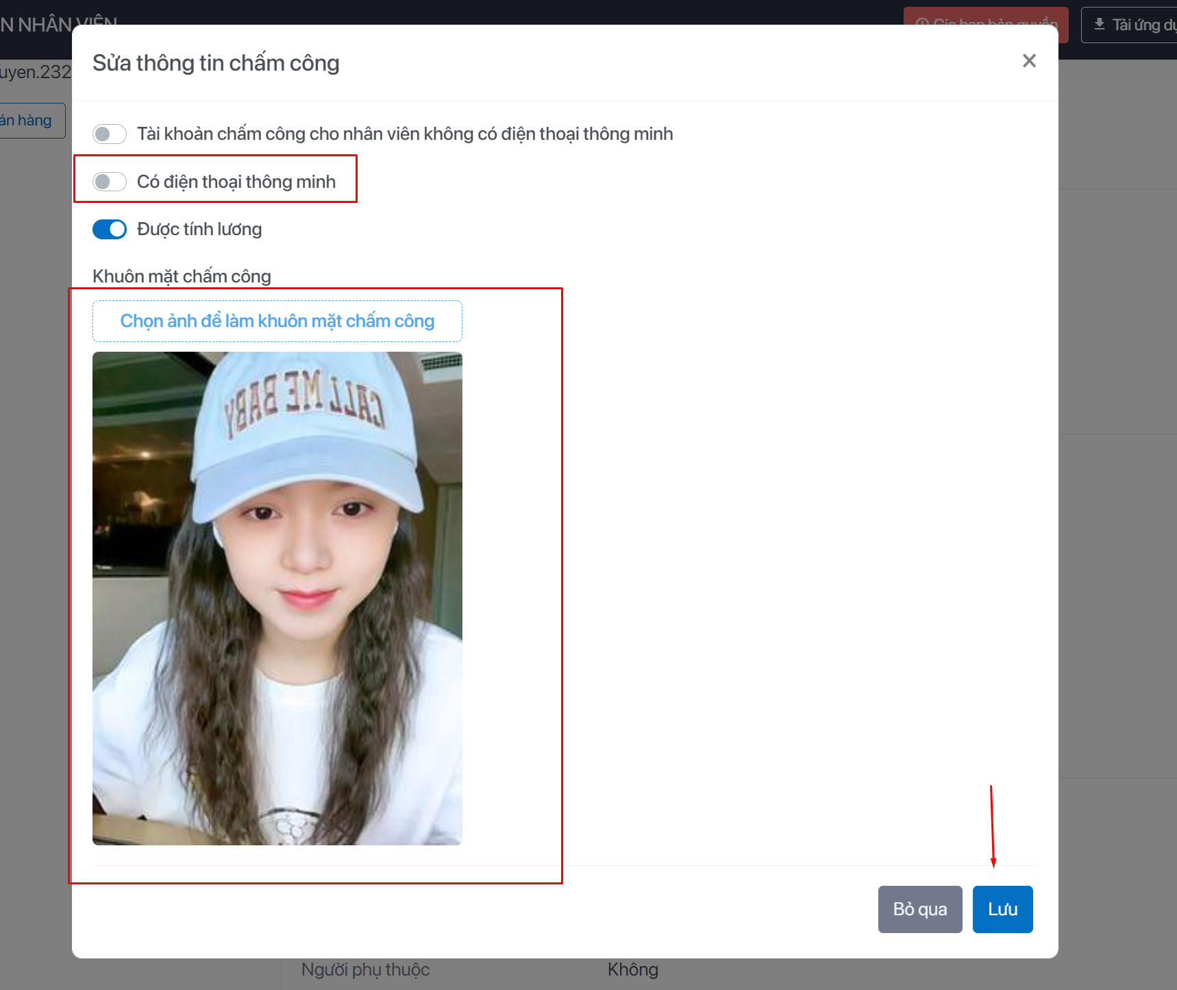 Bước 3: Chọn cấu hình Không có smartphone và Được tính lương → Cập nhật ảnh FaceID chấm công của nhân viên → Chọn vào Lưu để hoàn thành công việc.