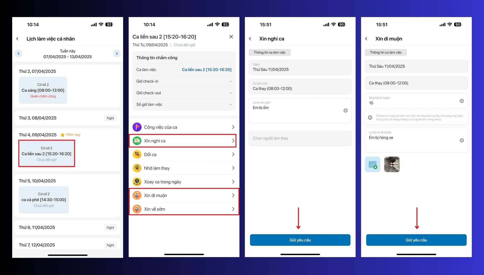 IV. Hướng dẫn thao tác xin đi muộn/về sớm/nghỉ ca:
