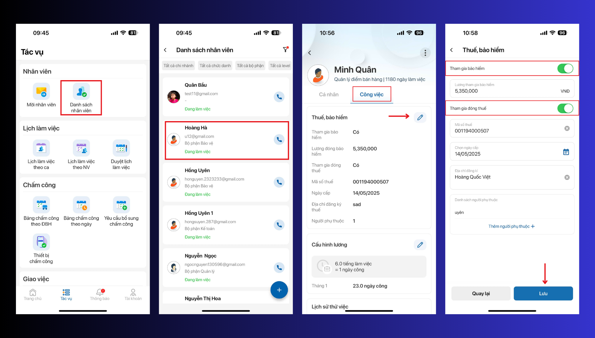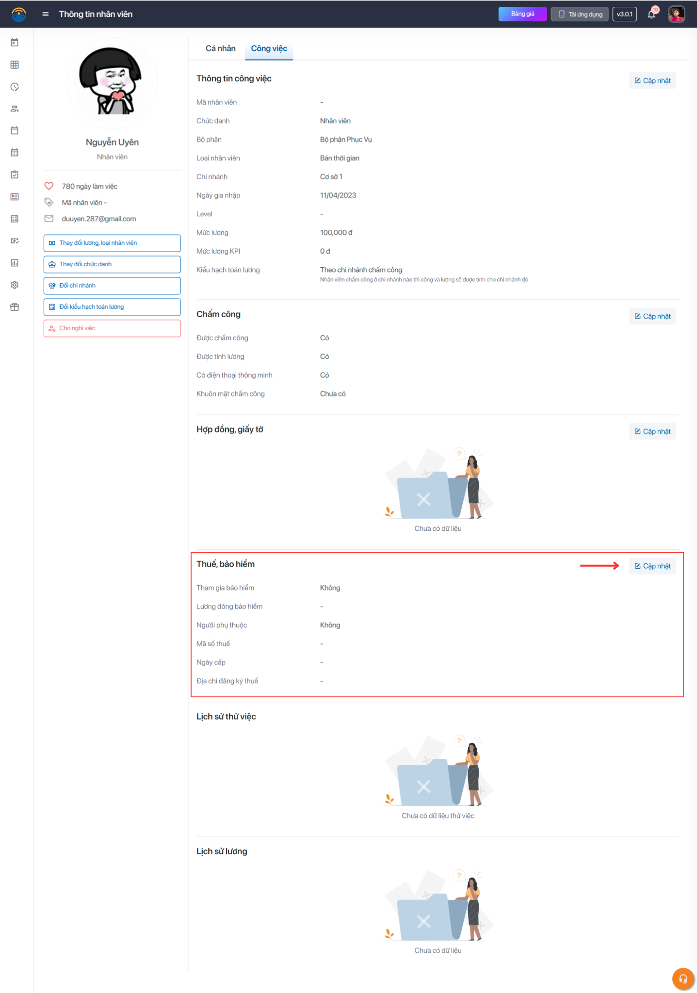 Bước 2: Chọn vào nhân viên bạn muốn cấu hình → kéo kịch thanh trượt để chọn trang Thuế/BHXH