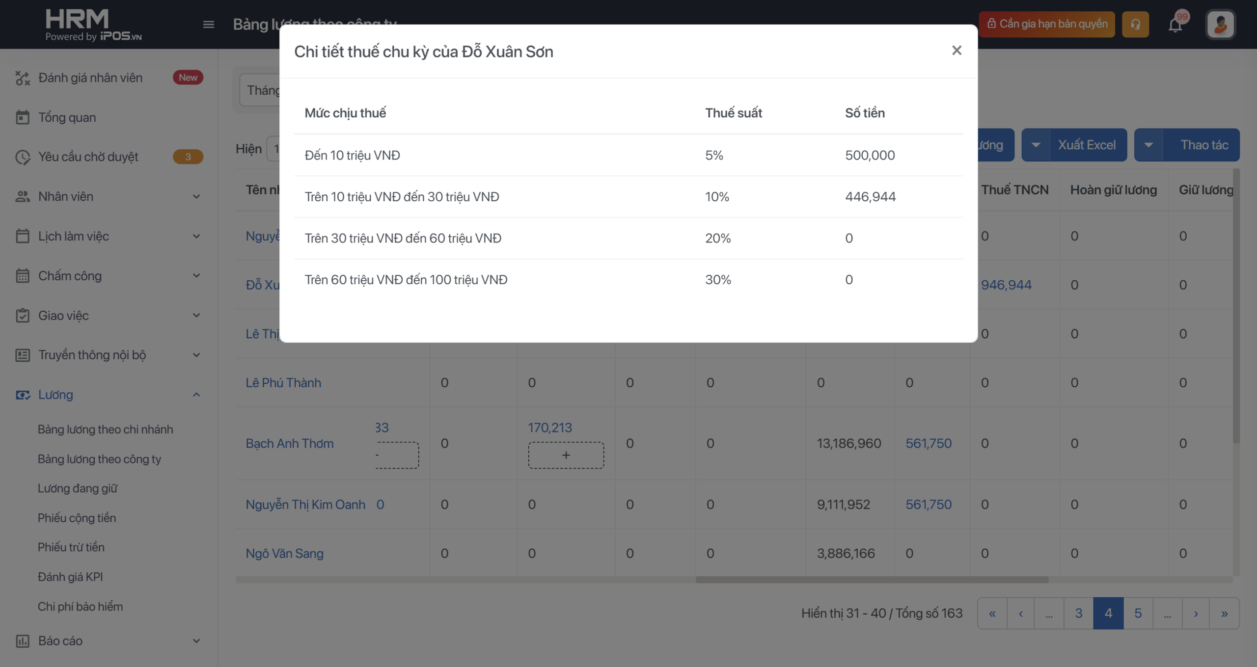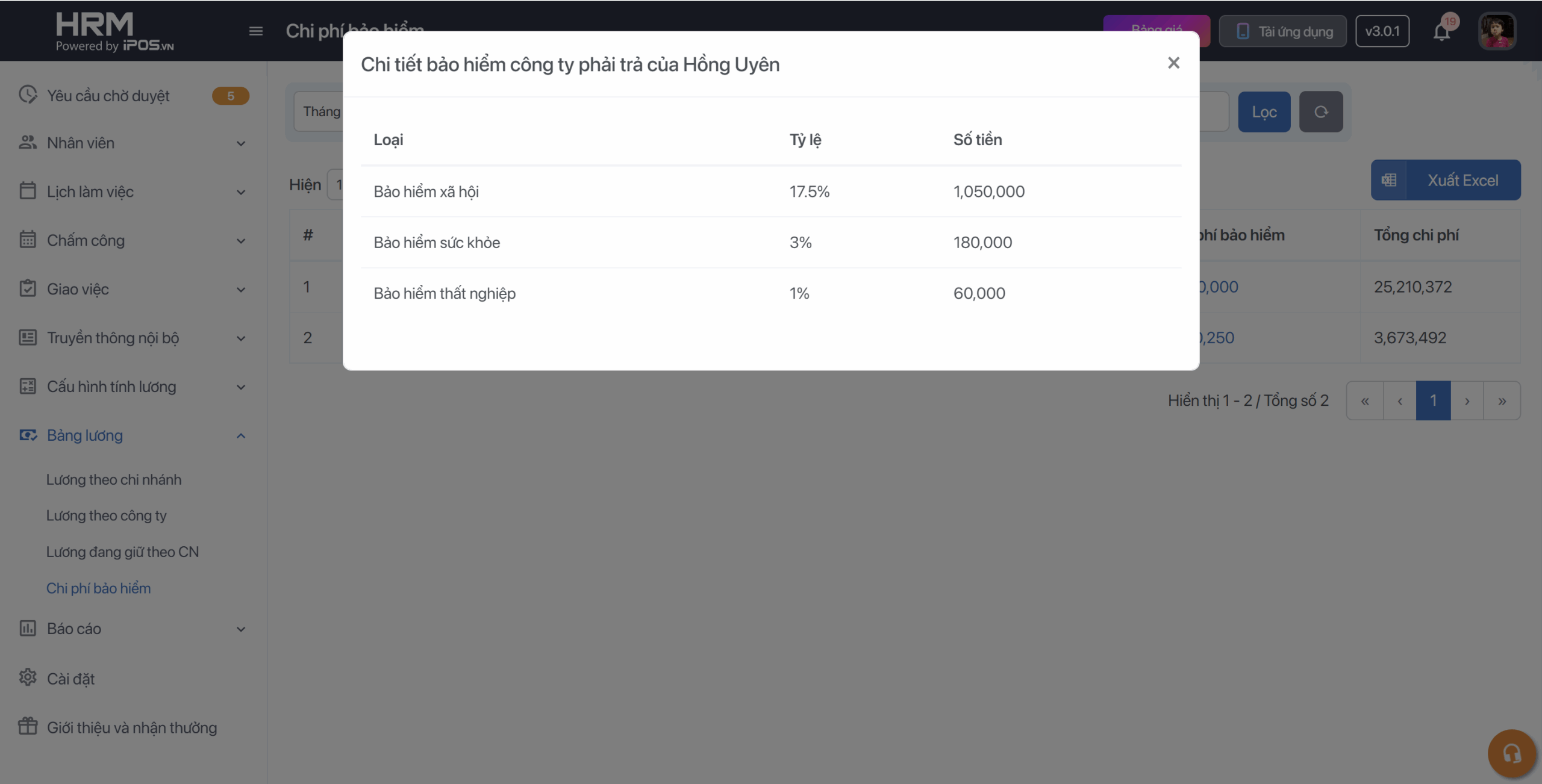 2. Hệ thống đã tự động tính toán và hiển thị phần chi phí mà nhân viên phải chi trả cho 2 khoản này ngay trên bảng lương