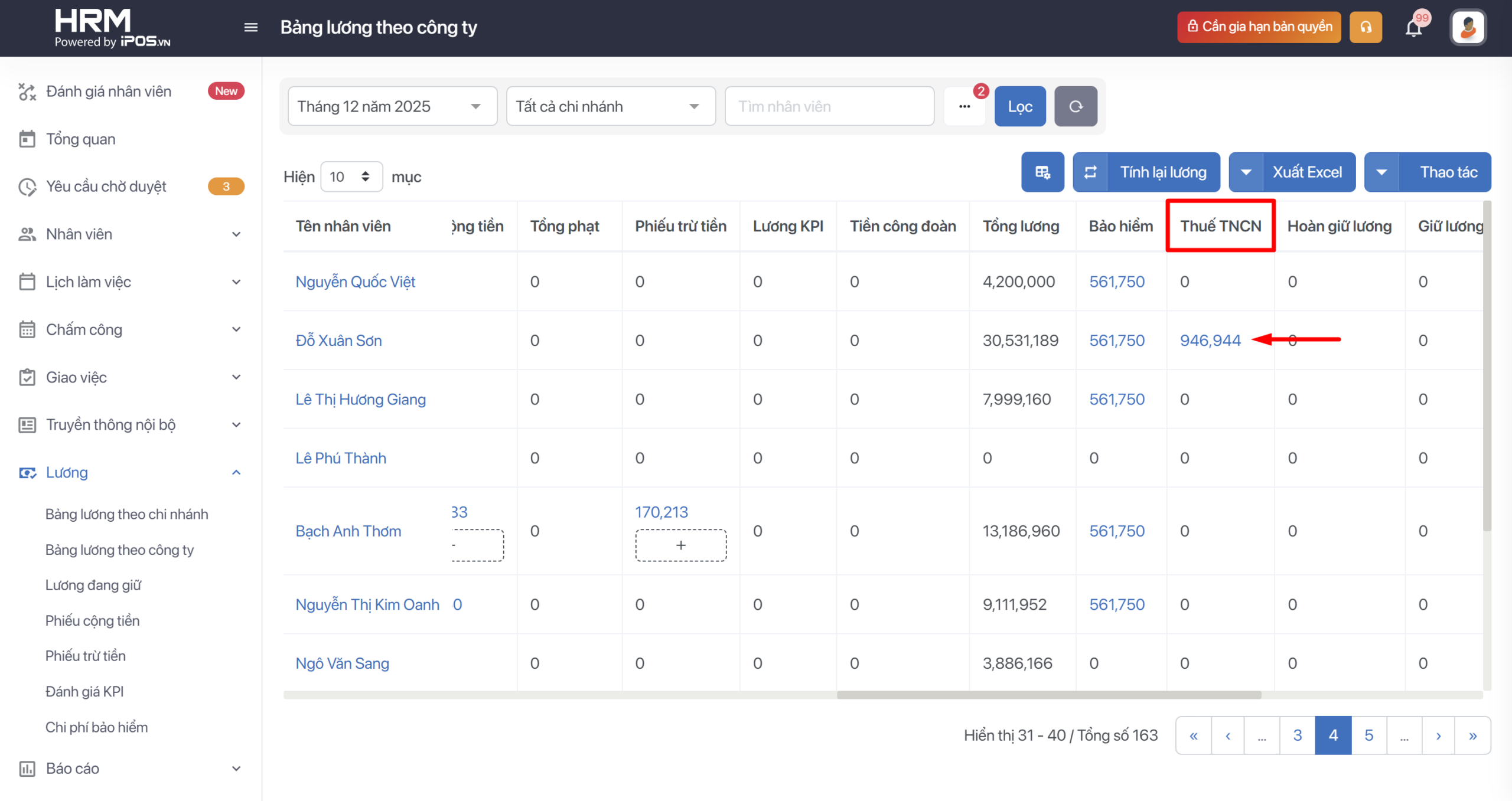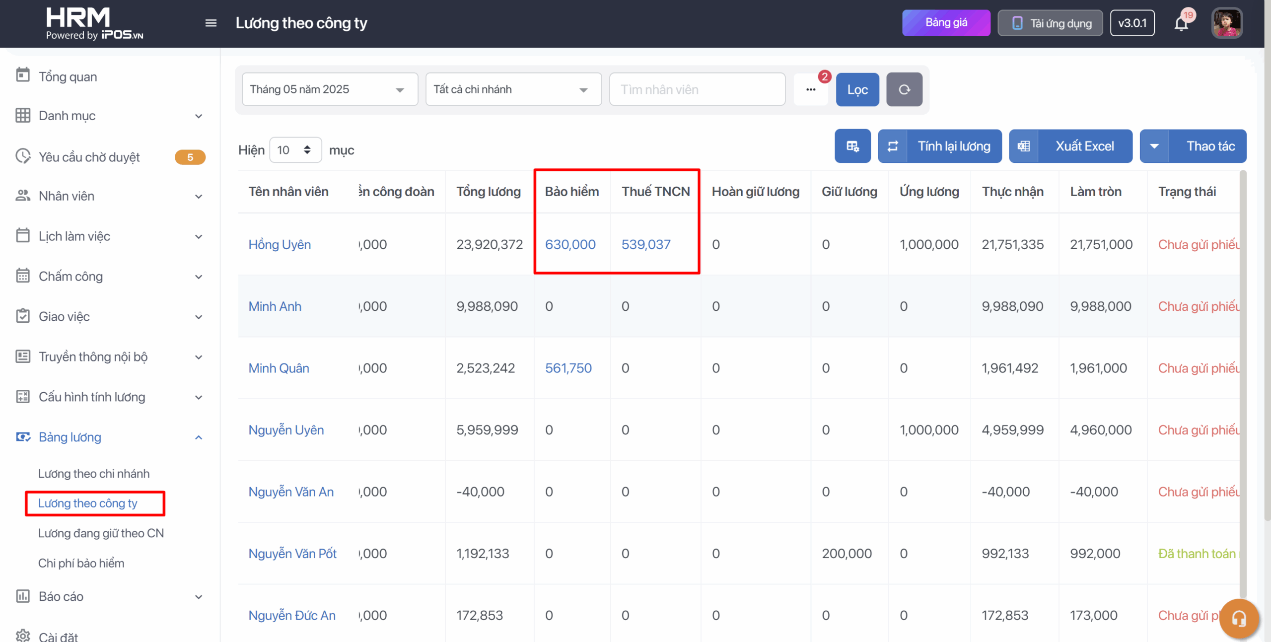 1. Phần BHXH và Thuế TNCN phải đóng của nhân viên sẽ chỉ hiển thị tại phần Bảng lương theo công ty.