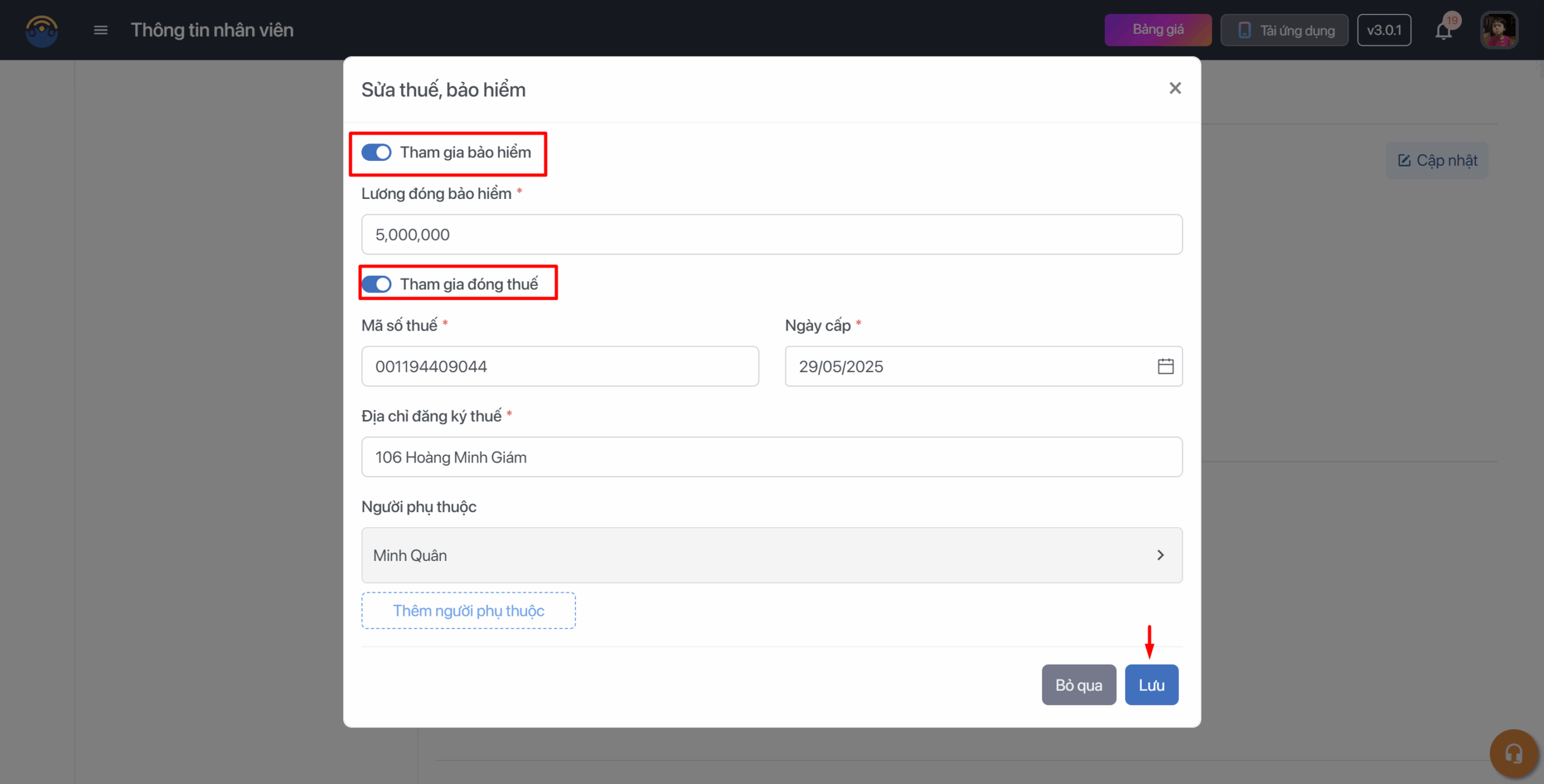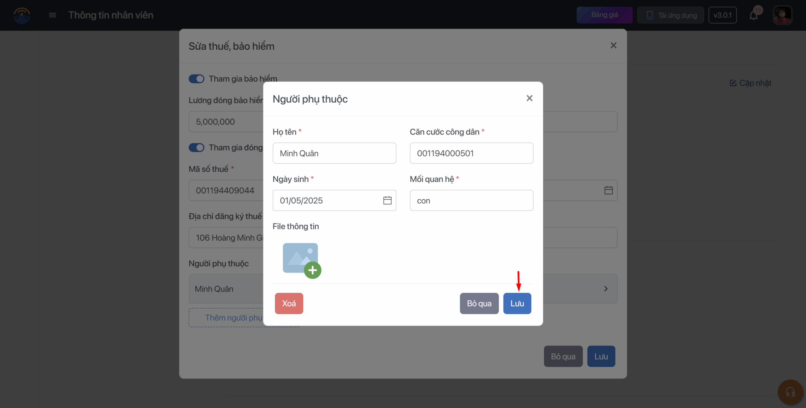 + Bước 2: Điền thông tin người phụ thuộc → Bấm lưu lại để hoàn thành công việc.