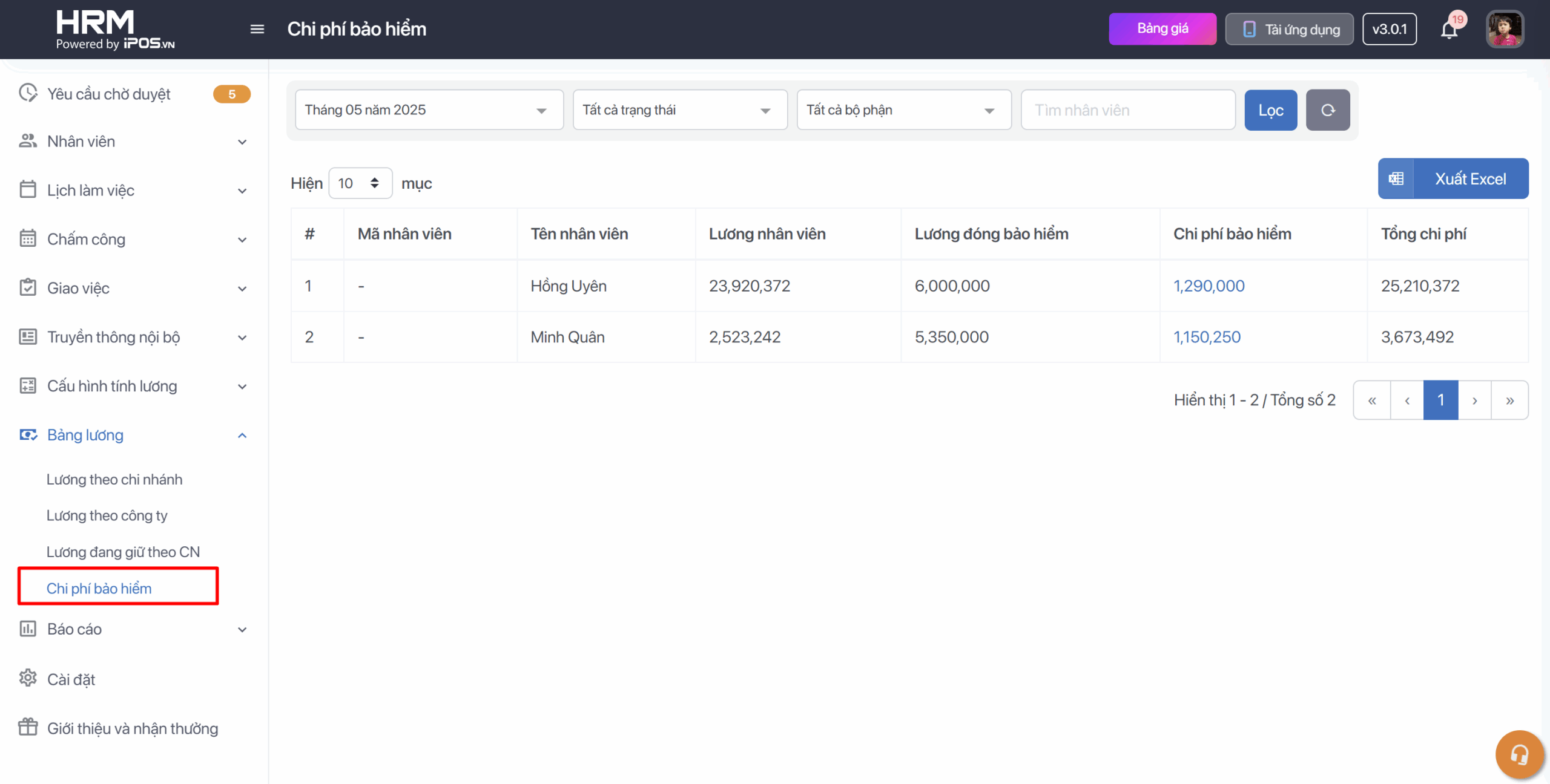 Bước 3: Bấm vào chi phí bảo hiểm của từng nhân viên để xem chi tiết nếu cần