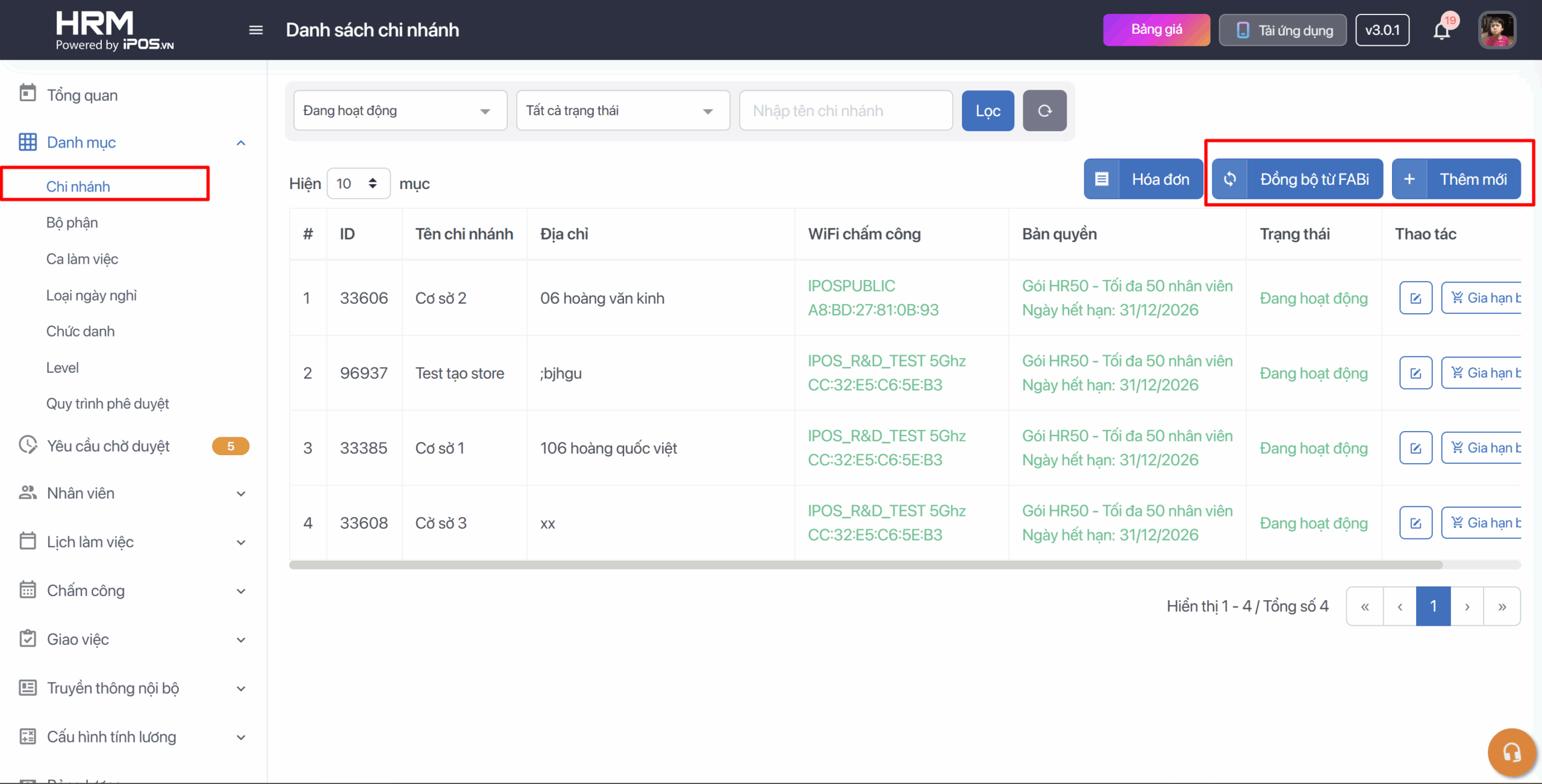 Bước 1: Trên thanh tác vụ chọn Danh mục → Chi nhánh → Đồng bộ từ Fabi hoặc Thêm mới