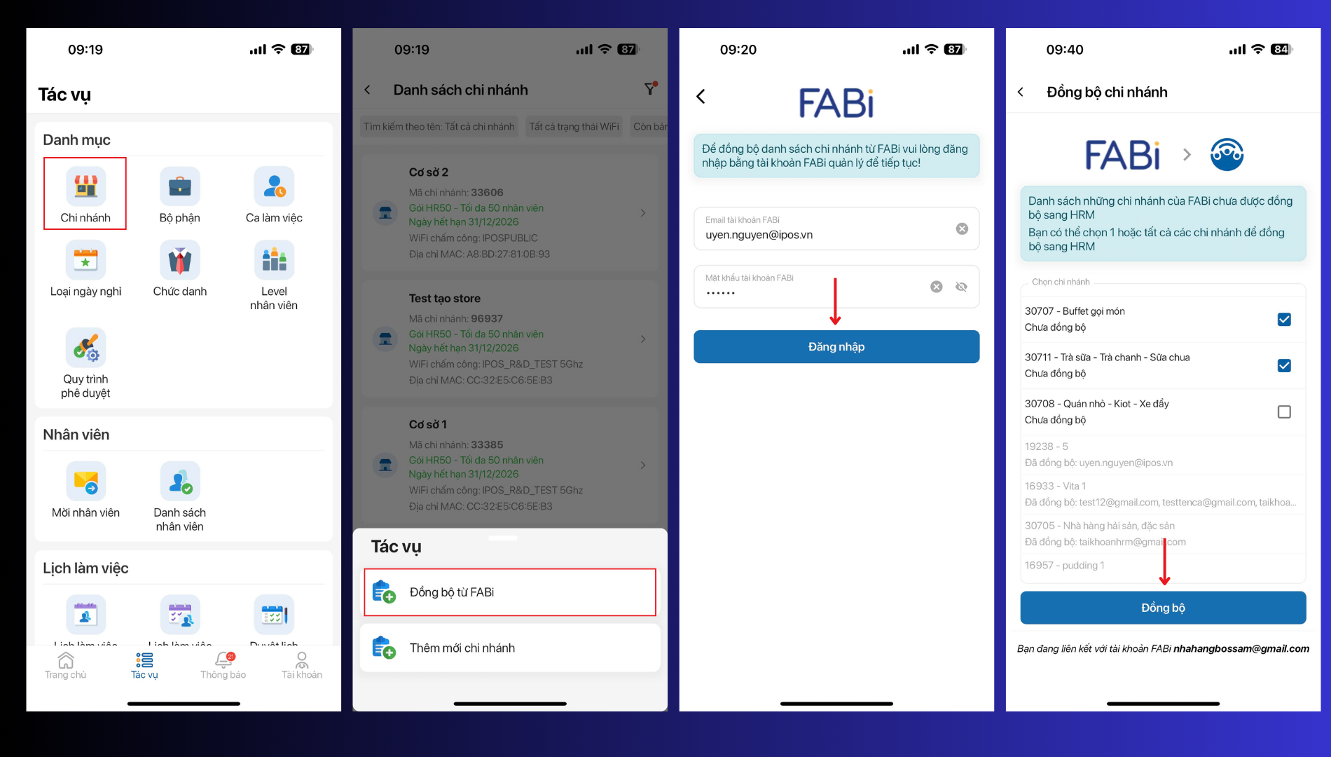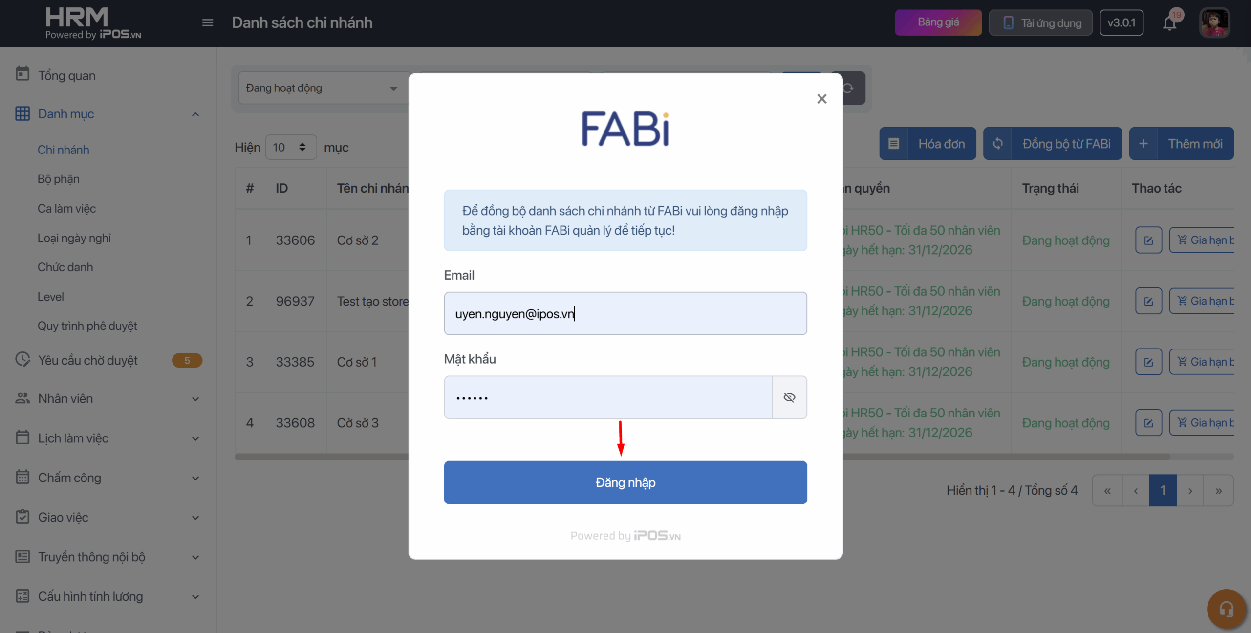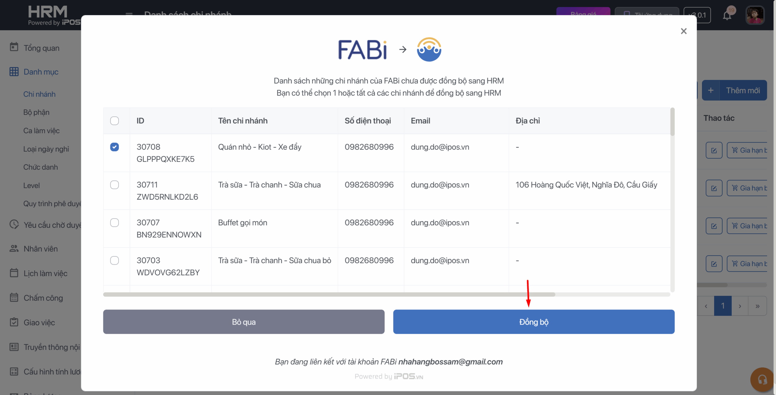 Bước 2: Đăng nhập bằng tài khoản FABi owner và chọn đồng bộ chi nhánh mà bạn muốn sử dụng → Sau khi bấm đông bộ thì danh sách chi nhánh sẽ hiển thị tại iPOS HRM.