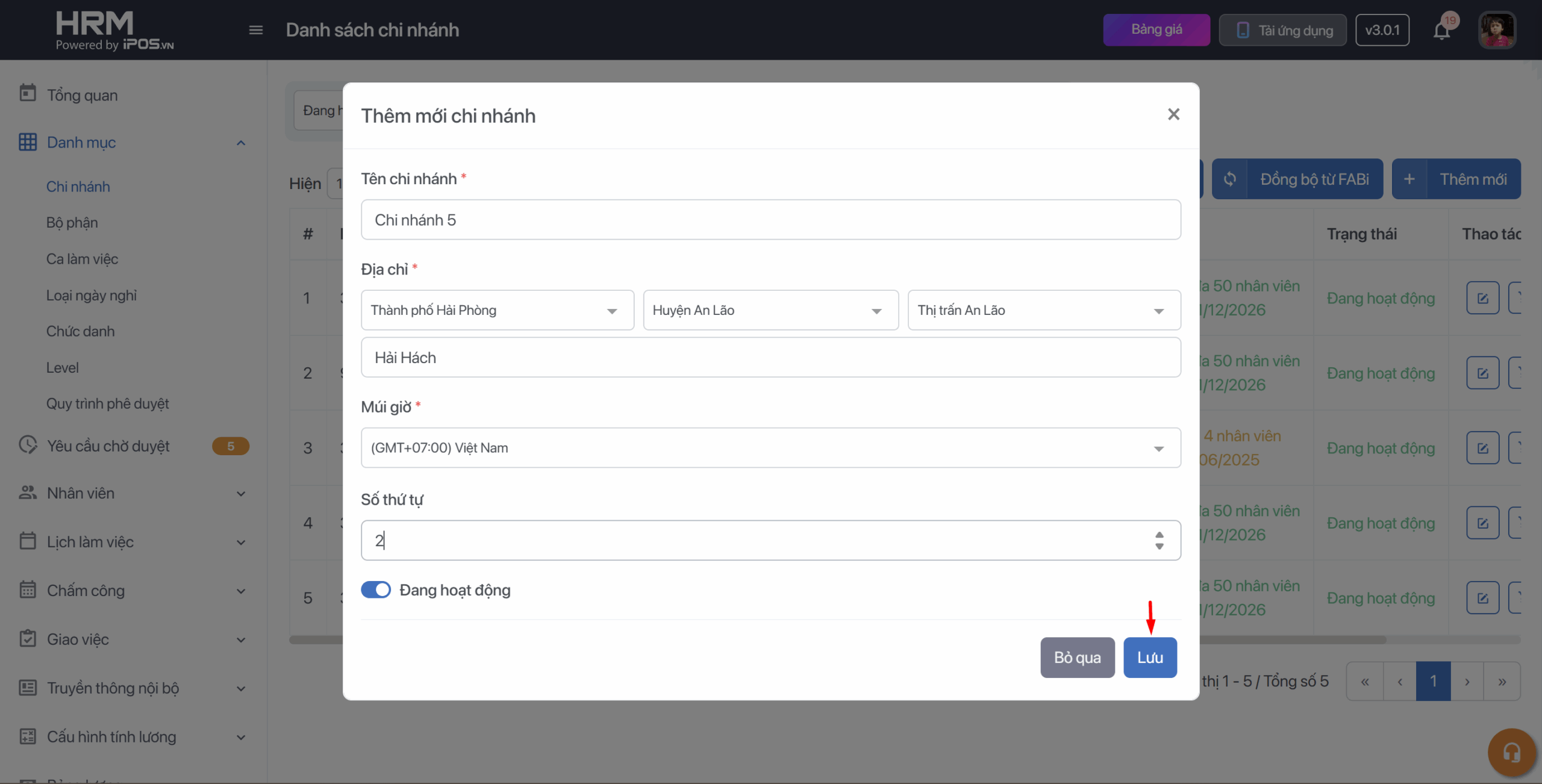 Bước 2: Điền đầy đủ thông tin chi nhánh → Bấm Lưu để hoàn thành công việc.