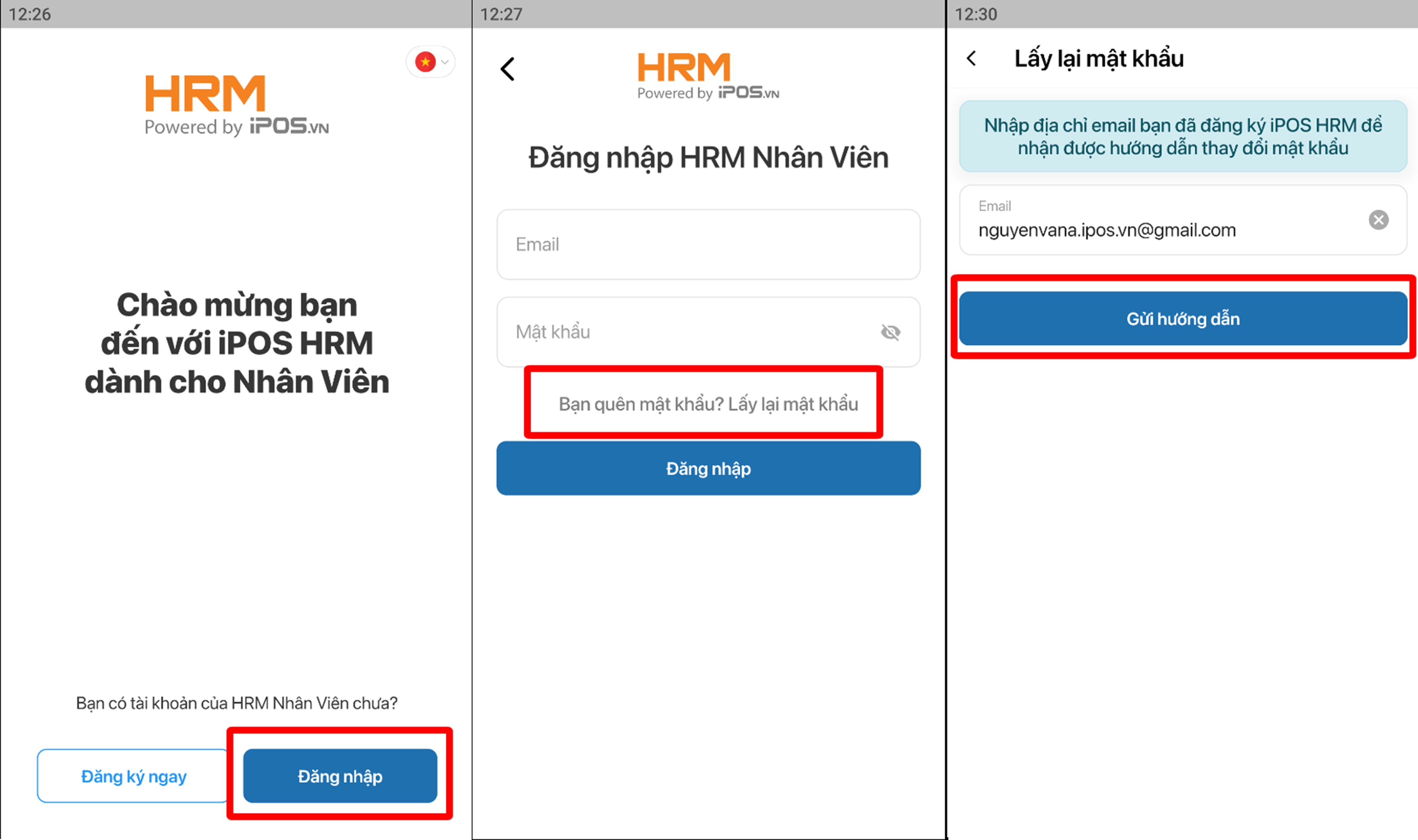 Bước 1: bạn vào app hrm nhân viên bấm nút lấy lại mật khẩu