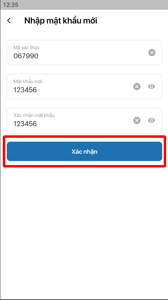 Bước 3: nhập mã xác thực và đặt mật khẩu mới cho phần mềm để hoàn thành công việc.
