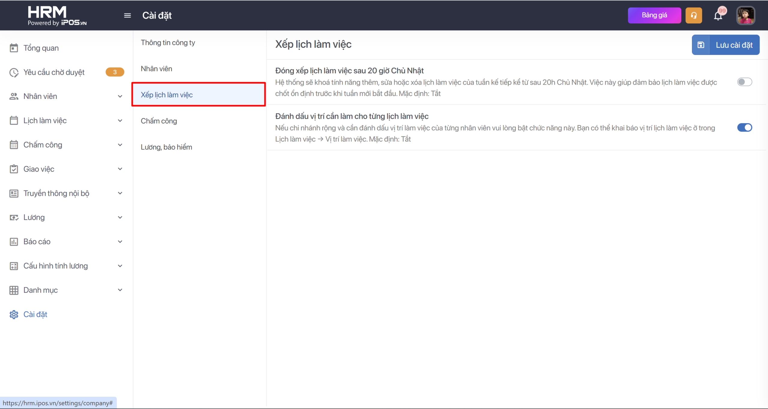 Mở khóa xếp lịch: Người phụ trách có thể thêm, sửa hay xóa lịch làm việc vào bất kỳ thời gian nào mà bạn muốn. Lưu ý: Người phụ trách sẽ không thể sửa hay xóa ca của nhân viên nếu họ đã thực hiện chấm công. Ví dụ: Nhân viên A đã Check-in Ca sáng [08:00 -12:00], trên lịch làm việc người phụ trách sẽ không thể xóa nhân viên A ra khỏi Ca sáng. - Đánh dấu vị trí trên lịch làm việc (hay còn hiểu là “khu vực làm việc”, “nơi làm việc”) khi xếp lịch làm việc cho nhân viên có mục đích rất quan trọng trong quản lý vận hành. Bật lên sẽ khai báo được vị trí làm việc