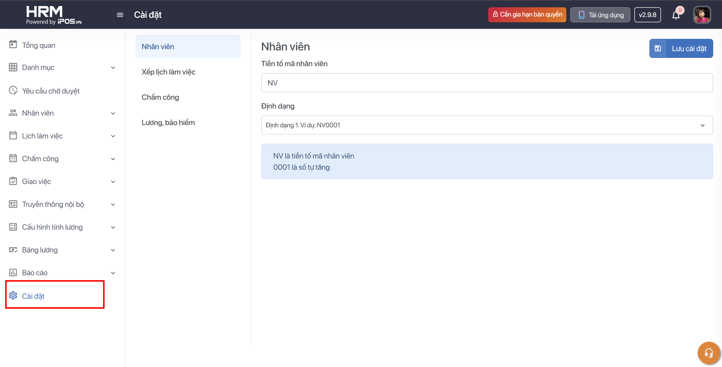 Cho phép cấu hình mã nhân viên chạy tự động. Bạn cần điền tiền tố của mã nhân viên + định dạng số chạy sau → Hệ thống sẽ tự động gen ra mã nhân viên theo số thứ tự tăng mỗi khi bạn khai báo thêm nhân viên mới.