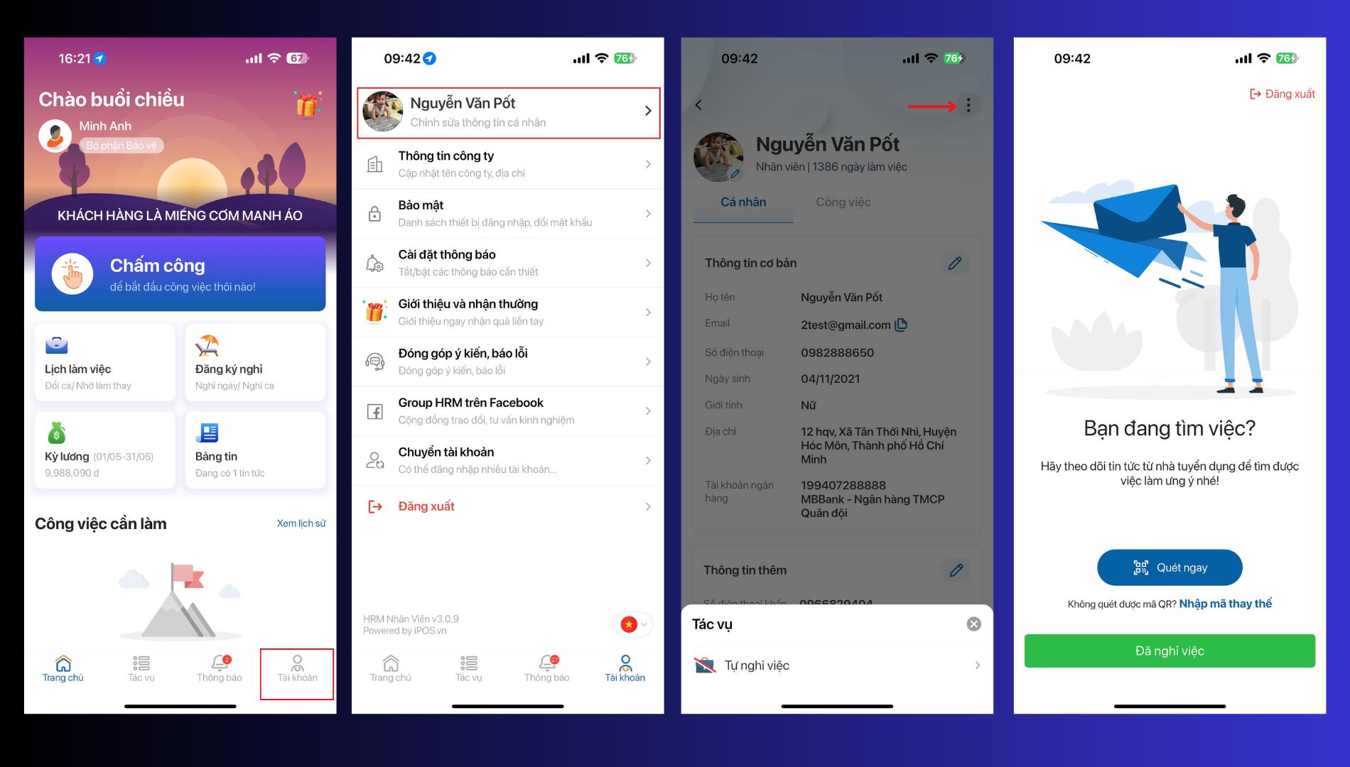 1. Hướng dẫn nhân viên xin nghỉ tại công ty cũ, để đảm bảo tài khoản HRM nhân viên của họ đang ở trạng thái đã nghỉ việc- đang tìm việc.