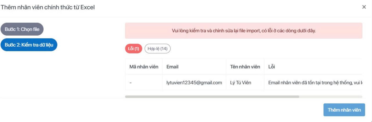 Khi bạn đưa thông tin nhân viên vào hệ thống bằng cách khai báo trực tiếp nhân viên hoặc import bằng file excel, nếu gặp thông báo lỗi hệ thống trả về như hình minh họa dưới đây: