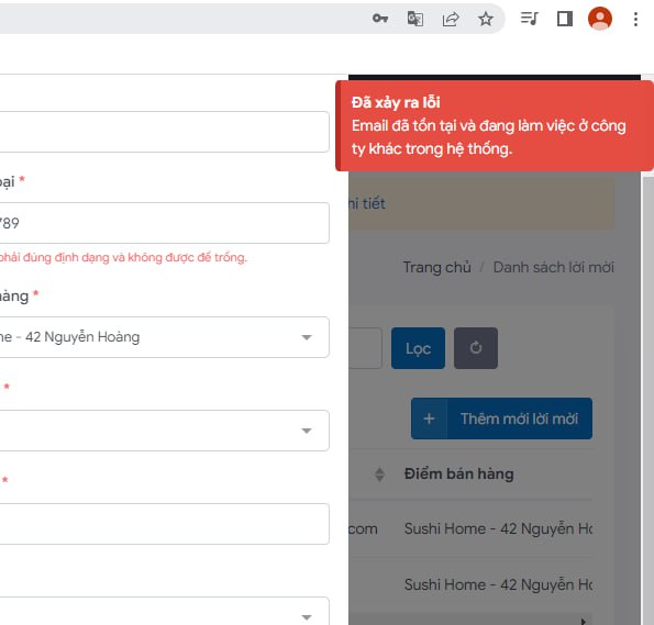2. Email đã tồn tại trong hệ thống và đang làm việc ở công ty khác.