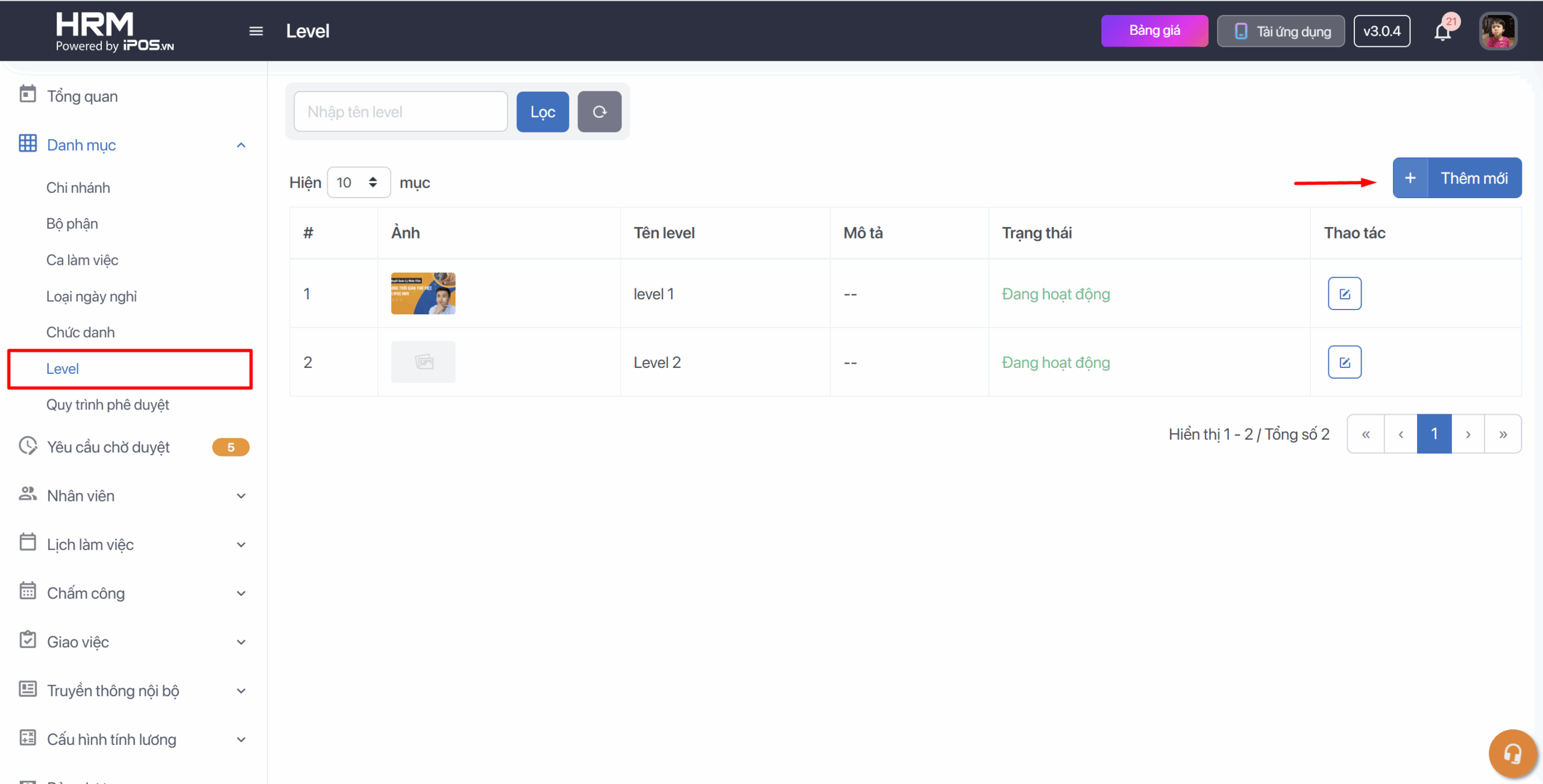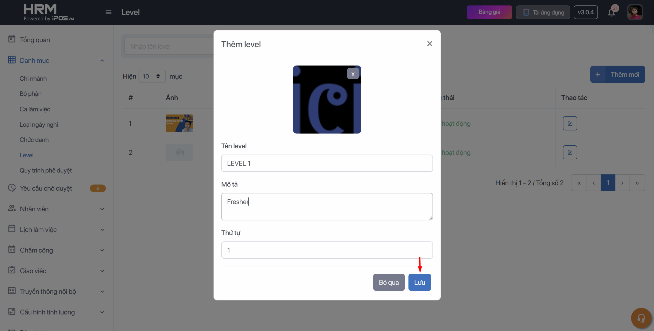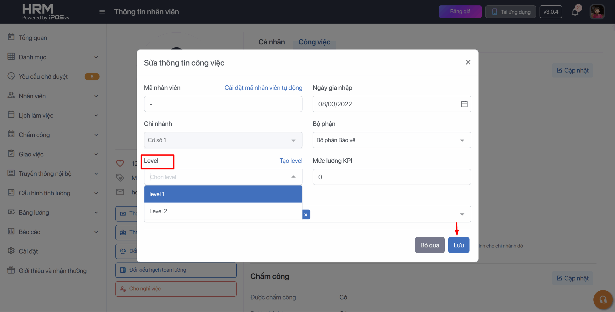 - Chọn Công việc → Chỉnh sửa → Chọn Level nhân viên và nhấn Lưu để hoàn thành công việc.