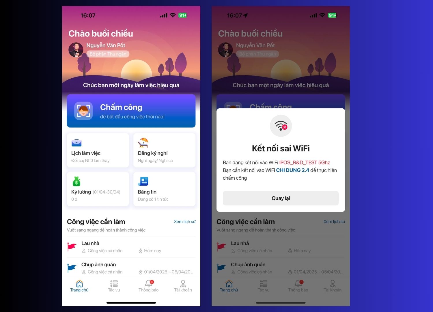 Bạn cần mở ứng dụng HRM Nhân Viên và bấm Chấm Công. Nếu hệ thống báo kết nối sai Wifi, bạn cần kết nối đúng vào wifi được in đậm màu xanh trong cảnh báo của hệ thống để thực hiện chấm công.