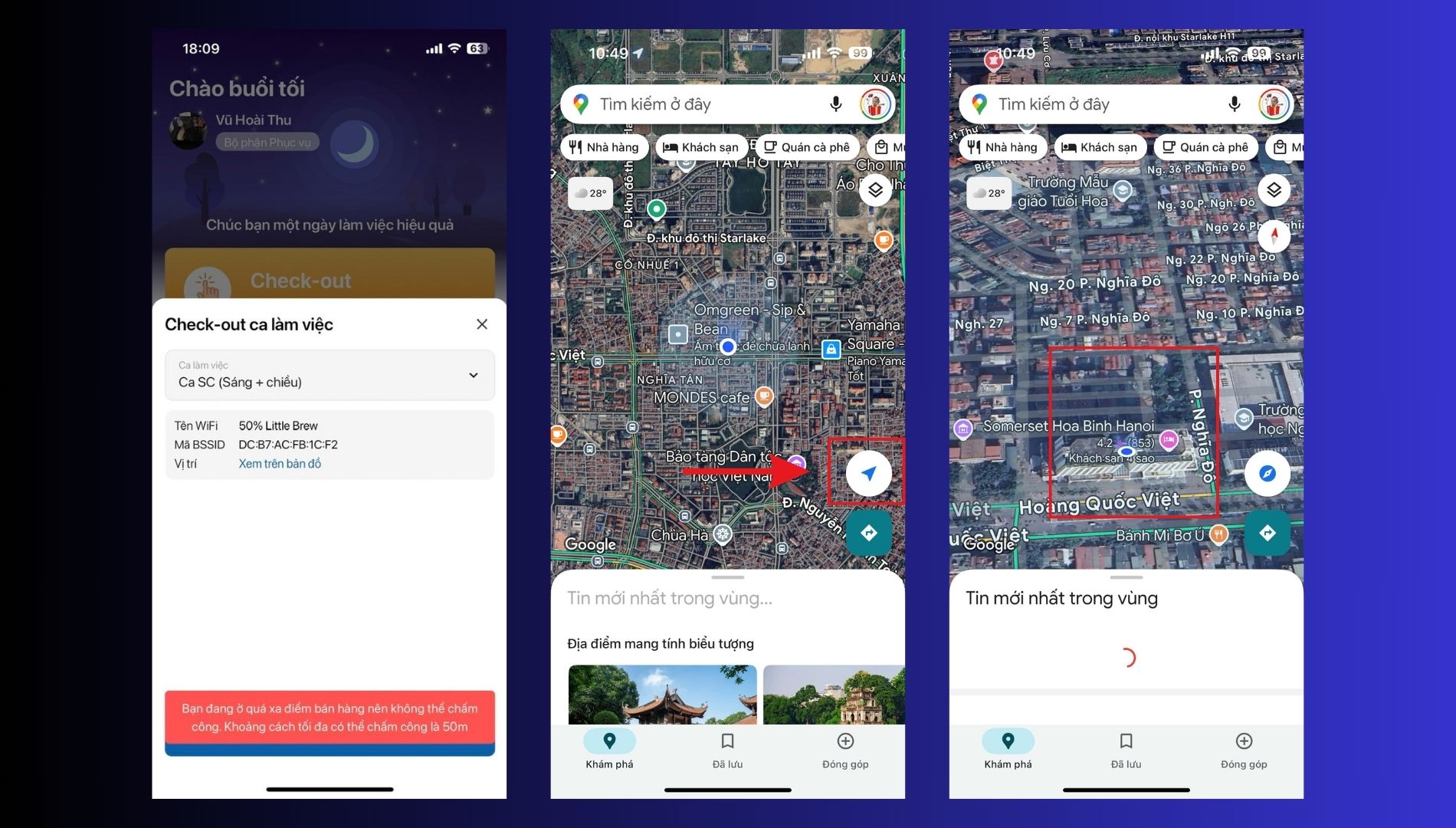 Khi gặp lỗi này nhân viên phải check xem thiết bị của mình đã định vị đúng vị trí ở cửa hàng chưa, do định vị GPS sẽ có sai số nên phải kiểm tra lại định vị, phải định vị đúng vị trí tại cửa hàng thì mới chấm công được.
