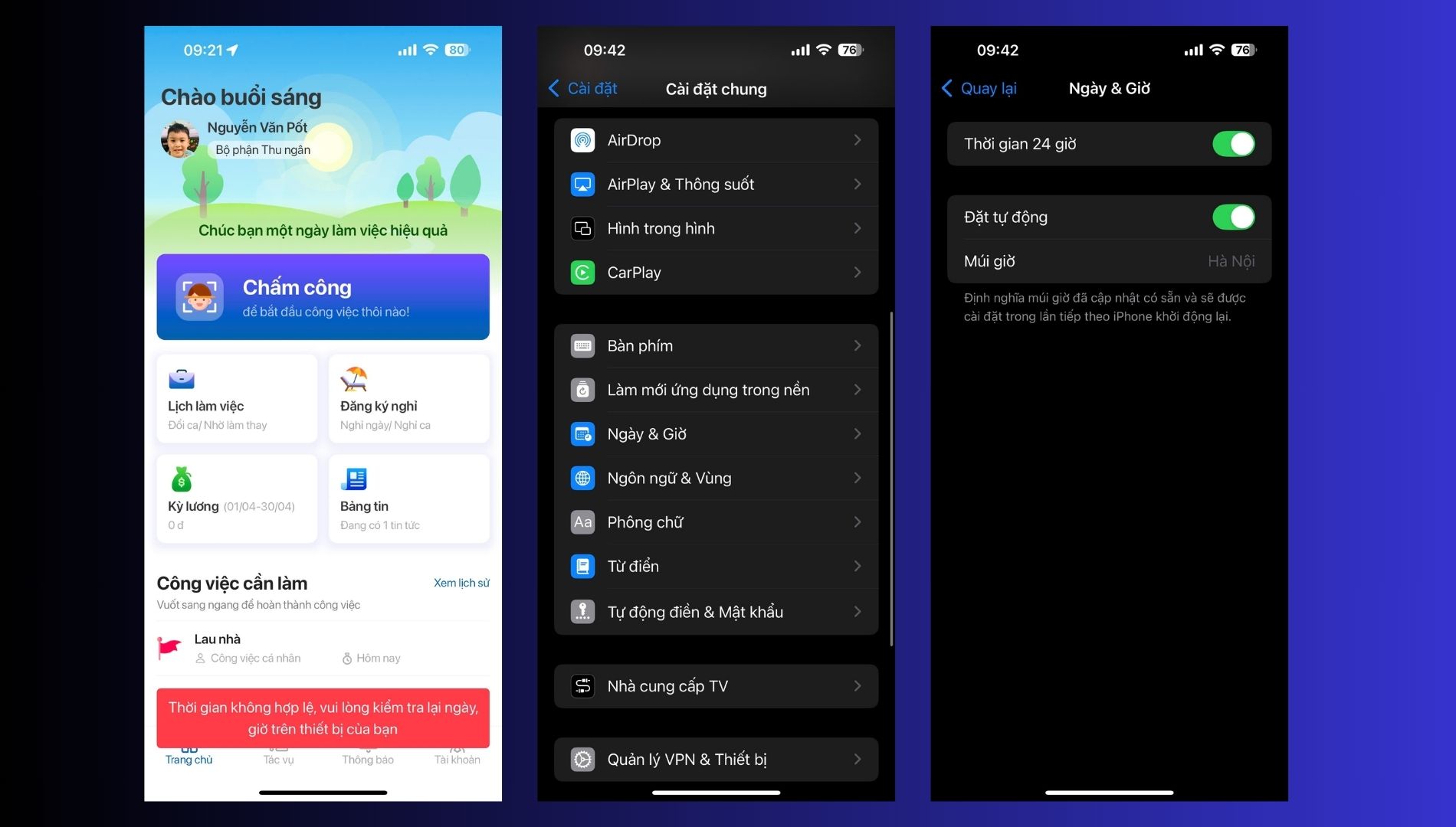 - Kiểm tra lại thời gian trên thiết bị chấm công của nhân viên: nếu không sử dụng tính năng dùng thời gian tự động thì vui lòng chỉnh sửa thời gian thủ công trùng với thời gian hiện tại của điểm bán hàng. Sau khi lưu lại, báo nhân viên tắt App và thử chấm công lại.