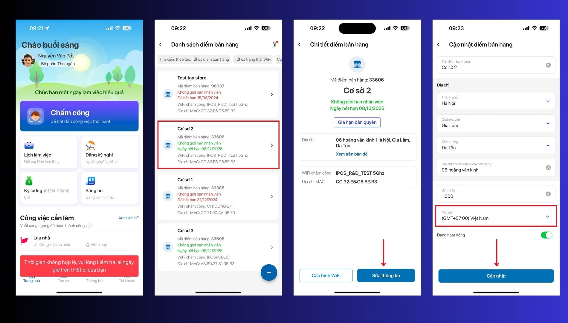 - Do điểm bán hàng bị cấu hình sai múi giờ hoạt động