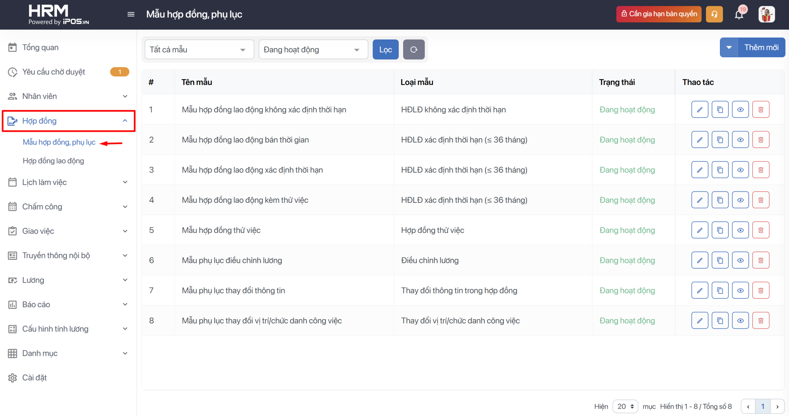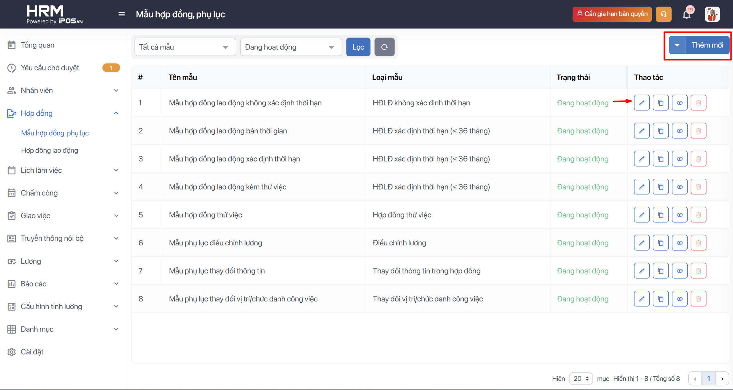 Bước 2: Bạn có thể tạo mới xem trước, chỉnh sửa, sao chép hoặc xóa các mẫu HĐ/PL này dựa vào các nút thêm sửa xóa như hình. Nếu muốn sửa lại Mẫu hợp đồng mặc định của hệ thống bạn chọn vào nút hình chiếc bút.