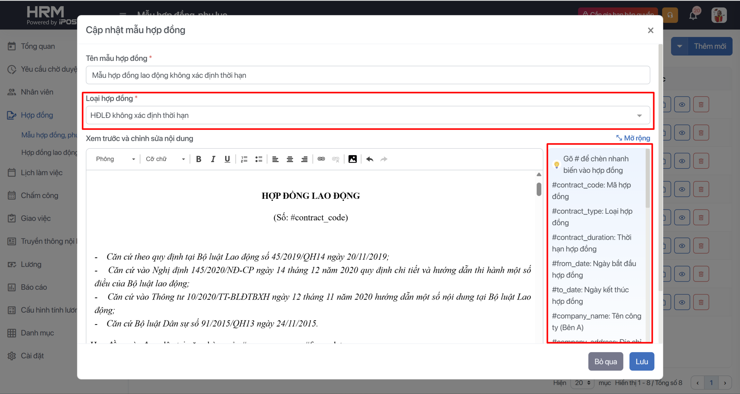 Tại đây, bạn có thể chỉnh sửa nội dung trong mẫu hợp đồng bao gồm: Tên mẫu, Loại hợp đồng ( phân loại hợp đồng theo tính chất, mục đích hoặc thời hạn) và Nội dung của hợp đồng. Mỗi khi bạn gắn hợp đồng cho một nhân viên, các biến # bên góc phải màn hình sẽ là các thông tin được hệ thống tự đồng điền vào hợp đồng, dựa trên các thông tin của nhân viên mà bạn đã khai báo. Sau khi chỉnh sửa mẫu hợp đồng xong, bạn chọn Lưu để hoàn thành công việc.