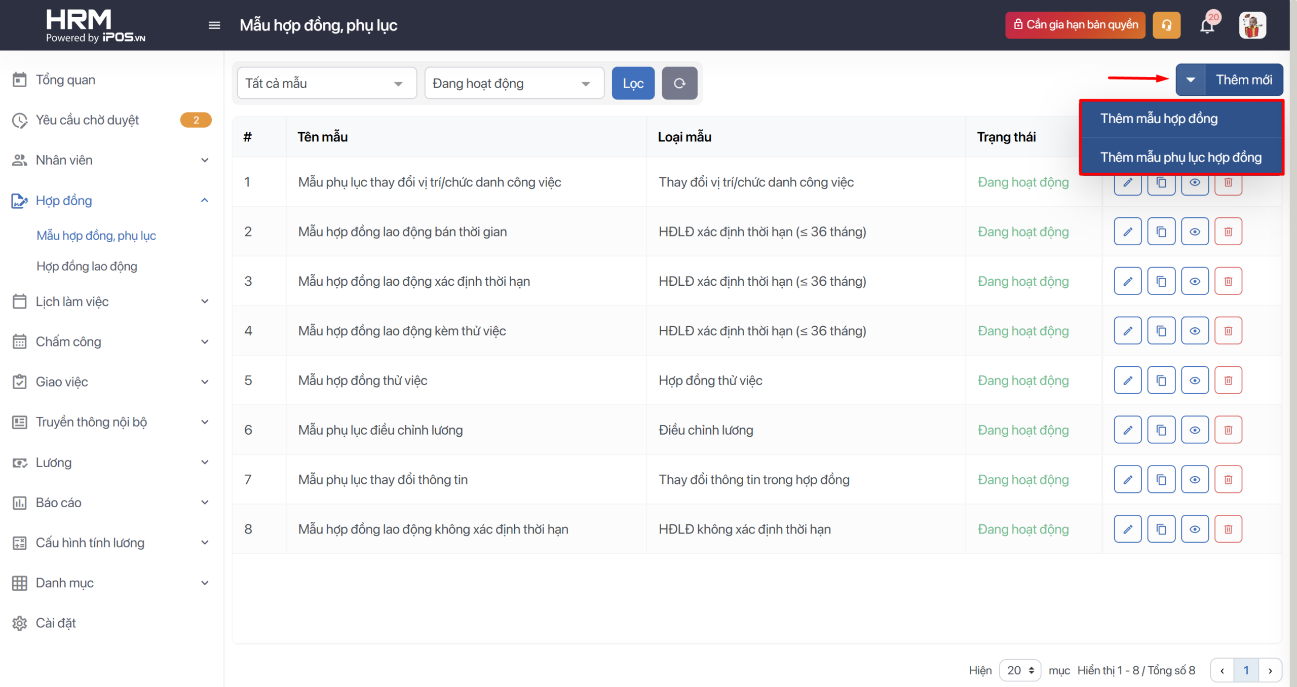 – Chọn Thêm mới ở góc trái màn hình để thêm mới mẫu hợp đồng hoặc thêm mới phụ lục hợp đồng dành riêng cho công ty bạn.
